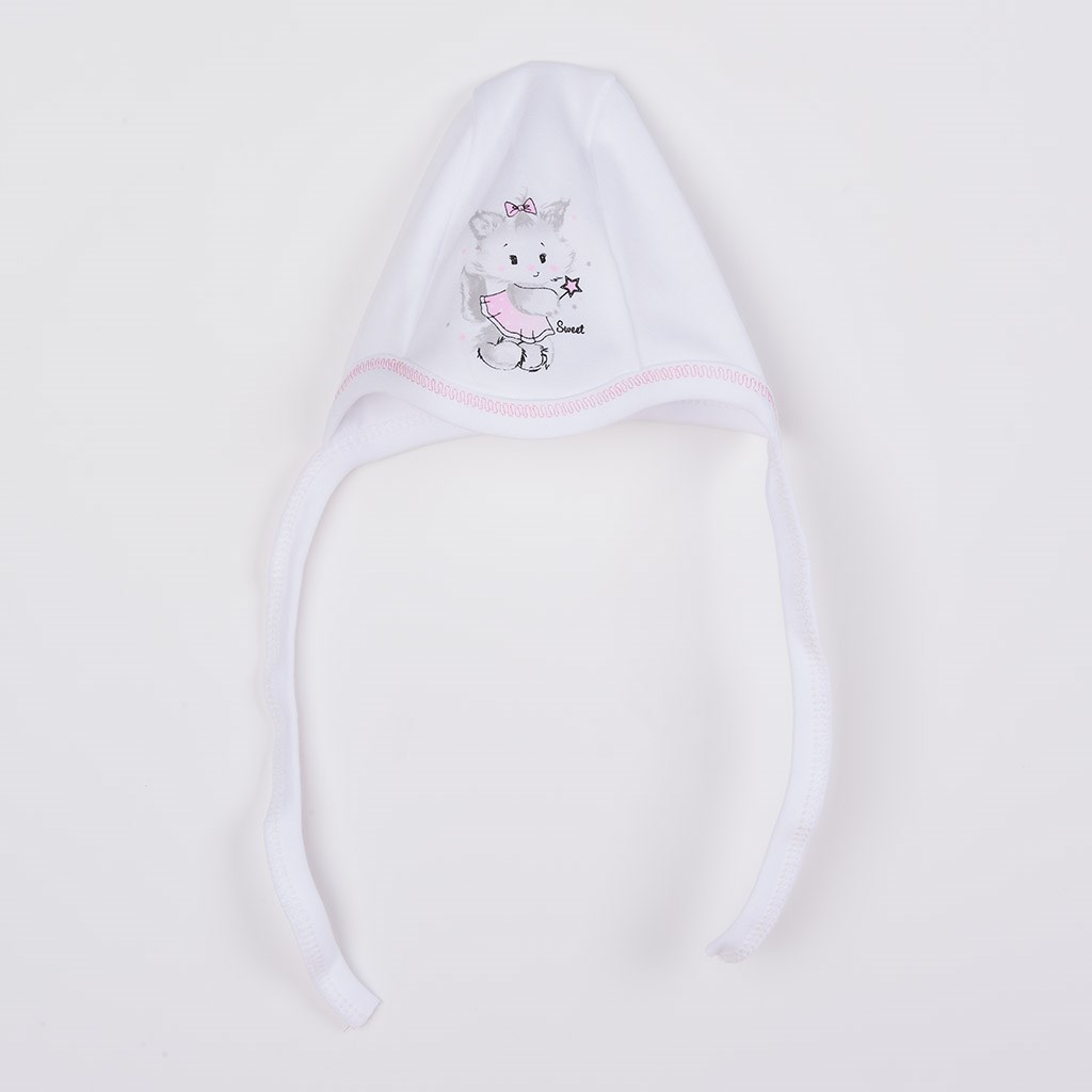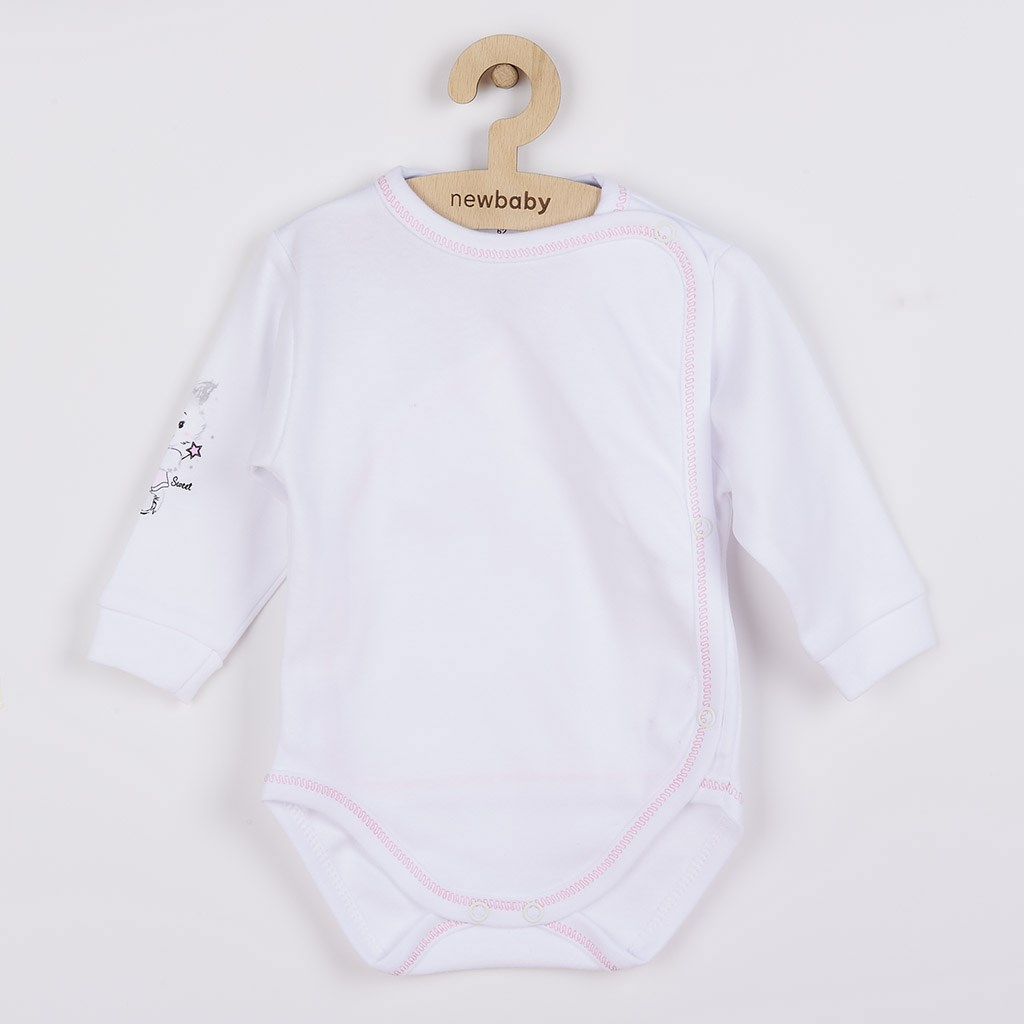 Beautiful 4 piece cotton baby set New Baby. Set includes a cap with lace-up fastening, long sleeve bodysuit with side fastening, onesie and gloves. The cap, bodysuit and onesie have a cheerful picture printed on them. The colours used for printing are certified and suitable for babies. The set is made of nice and high quality material in which your baby will feel comfortable. The bodysuit has a practical stud fastening along the entire length and between the legs, making it easy to dress and change the baby. The onesies have stud fastenings on the straps and between the legs. 100% cotton. Dimensions: onesies - chest circumference 45 cm, length from shoulder straps 47 cm, length from crotch approx. 16 cm, body - chest circumference 42 cm, length from shoulder straps 32 cm, sleeve length approx. 18 cm. Sleeves 8 cm. Cap - circumference around the head 36 cm.