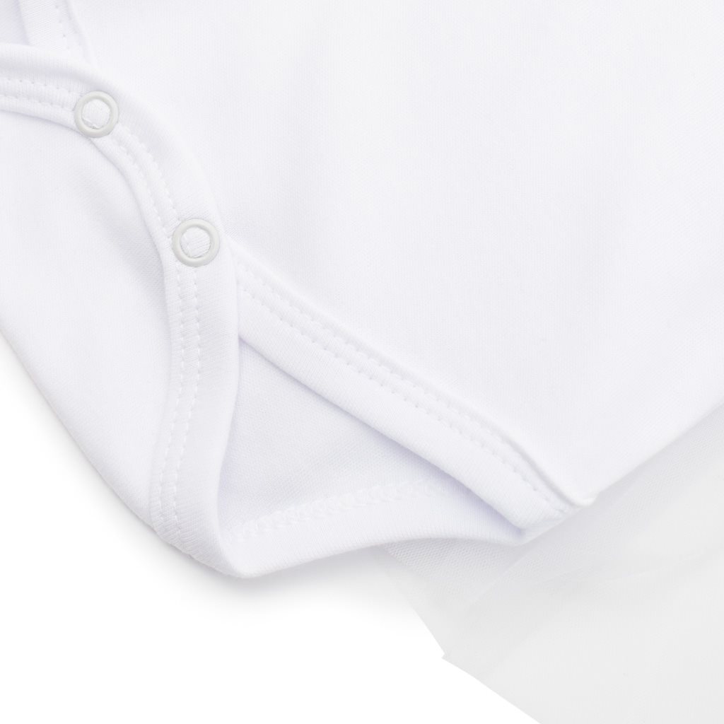 Beautiful cotton baby bodysuit with tulle skirt by Czech brand New Baby Wonderful for all little babies. The bodysuit has beautifully ruched balloon sleeves and stud fastenings on the shoulder and between the legs, making dressing and changing easier. It is decorated with cute embroidery of a cat. The embroidery is lined with anti-scratch fabric. The bottom of the body is decorated with a ruffled tulle skirt. Breathtaking, beautifully detailed from very nice material charming bodysuit for the smallest parade girls. We keep up with children's fashion and therefore offer you our New Baby Wonderful collection. Composition: body: 100% cotton, tulle skirt: 100% polyester.