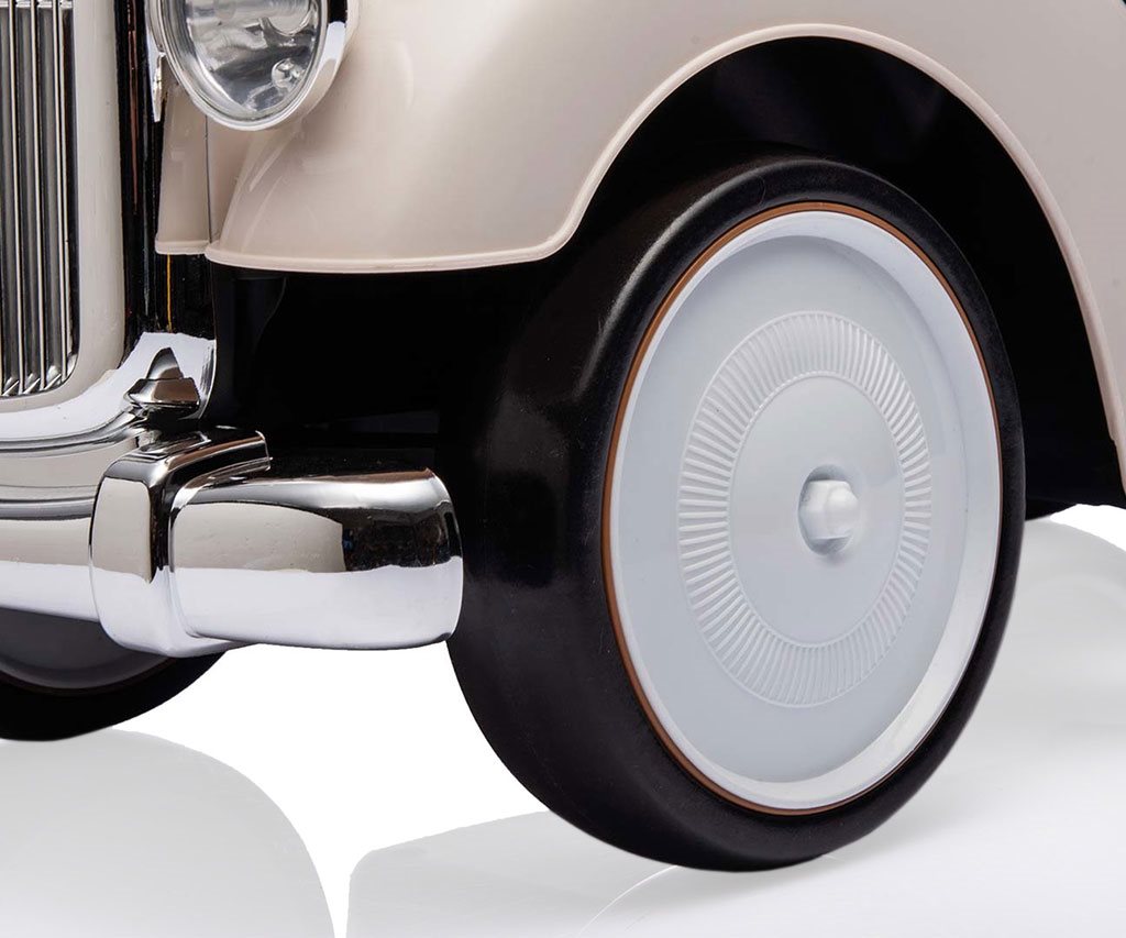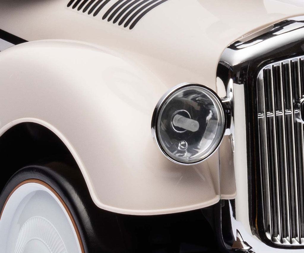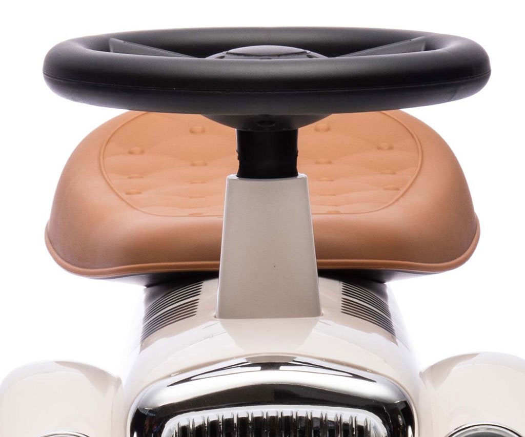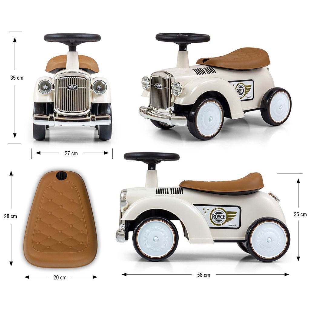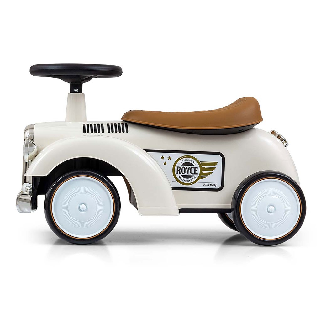 Milly Mally's Royce Vintige bouncer invites little travellers on a retro ride. It catches the eye with its eye-pleasing colours. It is richly equipped. This little car has a steering wheel with sound and a contoured seat. It will provide your child with great driving fun and develop their sense of balance and general motor skills. The car has a lightweight plastic construction and ergonomic shapes. The swivel steering wheel of our Royce rider allows for challenging manoeuvres at home and on walks. The wheels of this beautiful vehicle are made of soft EVA foam. The retro car can be used by your child as their first vehicle with a real steering wheel and horn, as well as a stroller with open storage for toys (small trunk), imitation fuel tank on the back of the vehicle and a front part of the car - the grille in silver. The ROYCE logo adds aesthetics and prestige to this vehicle. The final finishing touch to the Royce is its gift box, which retains the character of retro vehicles from the early days of the automotive industry. The Royce is designed for all children who can sit independently. The rover can be used indoors or outdoors and will make your child's walking time more enjoyable.