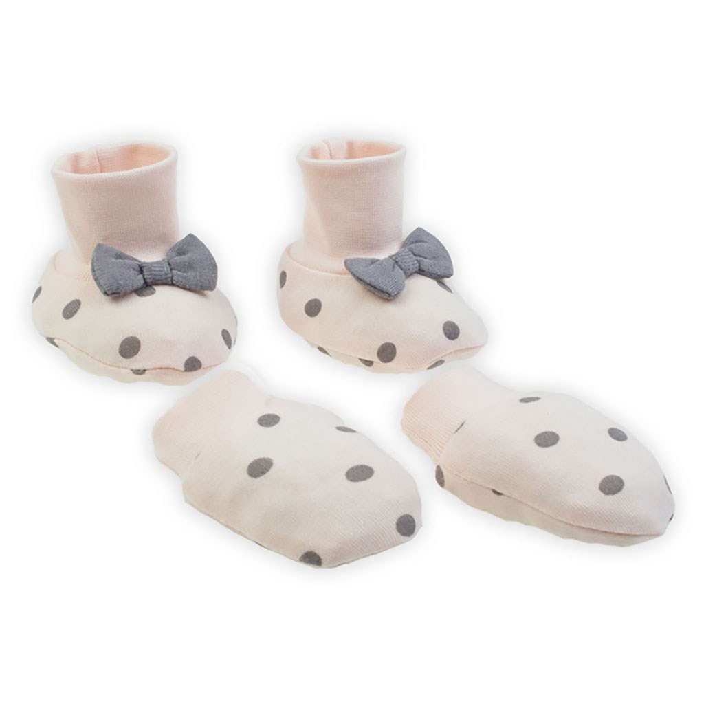 Beautiful and practical Nicol Sara cotton set. The set consists of caps and gloves. The caps and gloves are decorated with a cute pattern and have drawstring cuffs. 100% cotton.