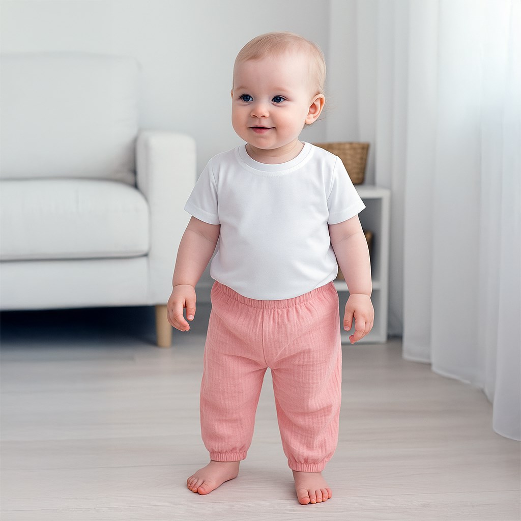Stylish and Practical 2-Piece Children's Set New Baby Kindergarten. The set consists of a cotton short-sleeve T-shirt and muslin pants. A very practical set for children, even for kindergarten. The cotton T-shirt is very comfortable as it is made from high-quality cotton, with no fastenings, and has a soft hem around the neckline. The hem must not be tight, should fit well, and the T-shirt must be easy to put on over the head. The muslin children's plain pants with a modern design are made from high-quality muslin. For very easy dressing, they have a practical loose fit, with an elastic band at the waist and cuffs that does not press. The pants are also very suitable for regular children's activities. Composition: 100% cotton. OEKO-TEX STANDARD 100.