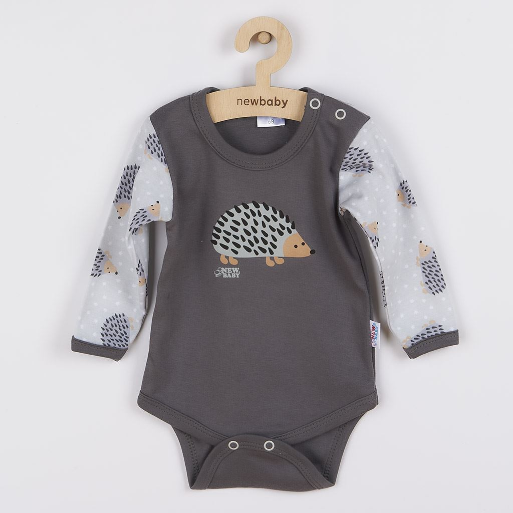 Imaginative and cool cotton baby bodysuit with long sleeves from the Czech brand New Baby Ježek for babies. Baby bodysuit has sleeves printed with little hedgehogs. The front of the bodysuit is decorated with a big picture of a cute little hedgehog. Practical stud fastening on the shoulder and between the legs will make dressing and changing very easy. We put emphasis on quality and therefore, thanks to the soft and high-quality material, your baby will feel very comfortable in the bodysuit. Imaginative and cool, that's exactly what our New Baby Hedgehog collection is all about. 100% cotton.