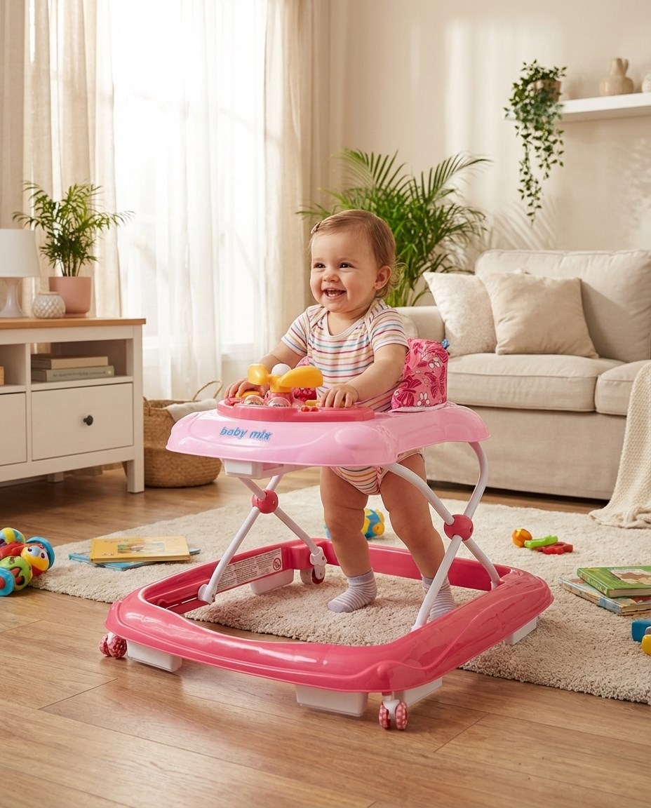 Baby Mix multimedia walker with silicone wheels. The walker is equipped with a comfortable ergonomically shaped seat that ensures the correct posture of the spine. The multimedia panel includes various light effects, a honking steering wheel that can be turned, buttons to play melodies and two lights. The beautiful toy walker will enchant little explorers and allow them to play even longer. The walker is equipped with a special anti-tip system to ensure your child's comfort and safety.