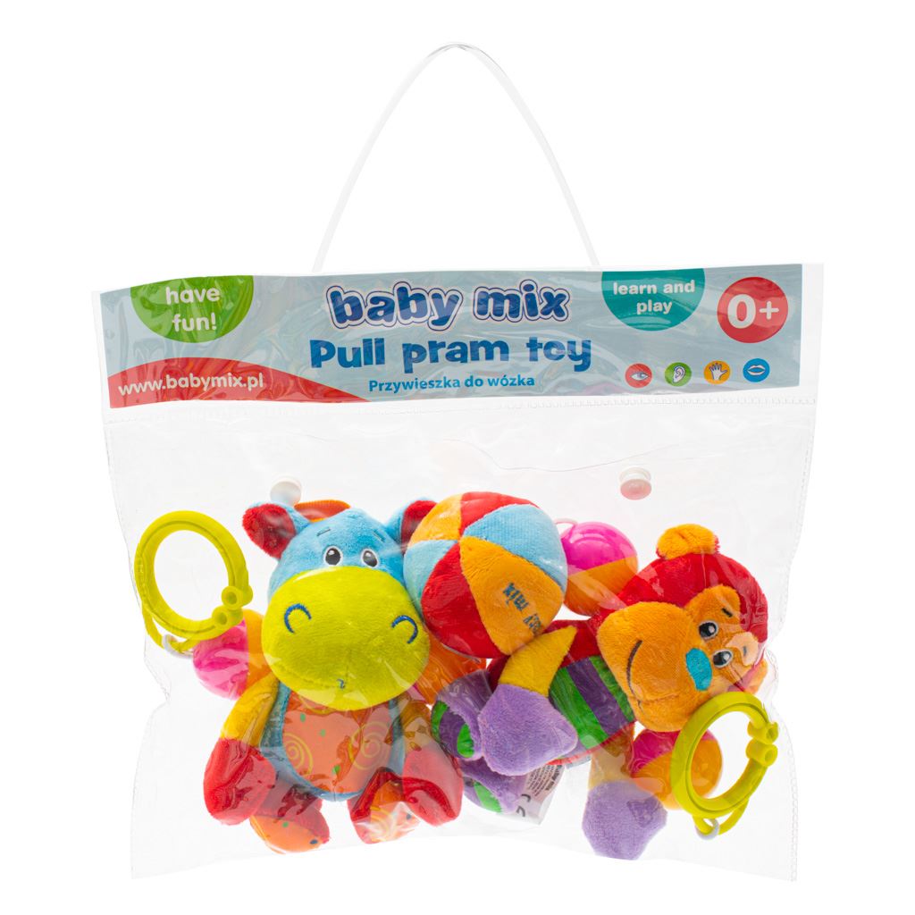 Beautiful colourful plush Baby Mix rattle for your baby. The stroller rattle has two plush figures, a ball and four plastic balls that rattle. The rattle is made of high quality materials. It has interesting shapes and helps in the motor development of the baby. The baby rattle can also be attached to a cot or cot bed. The rattle is suitable for children from birth. Length approx. 52 cm, height of the figures approx. 15 cm.