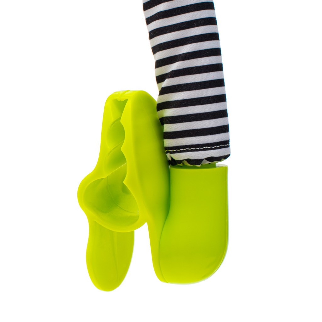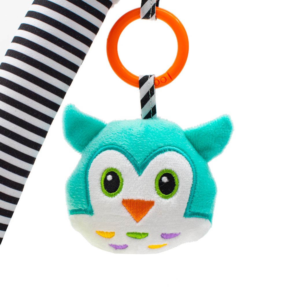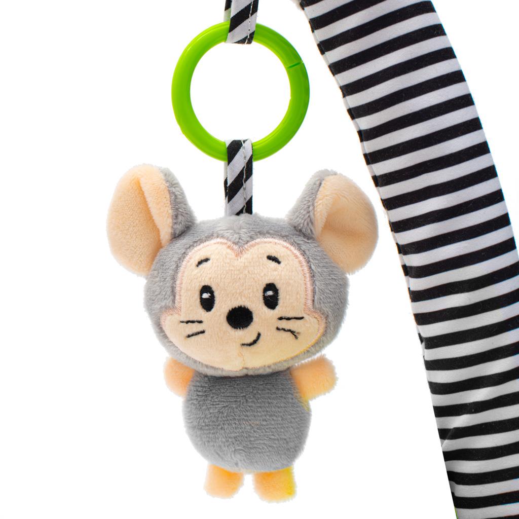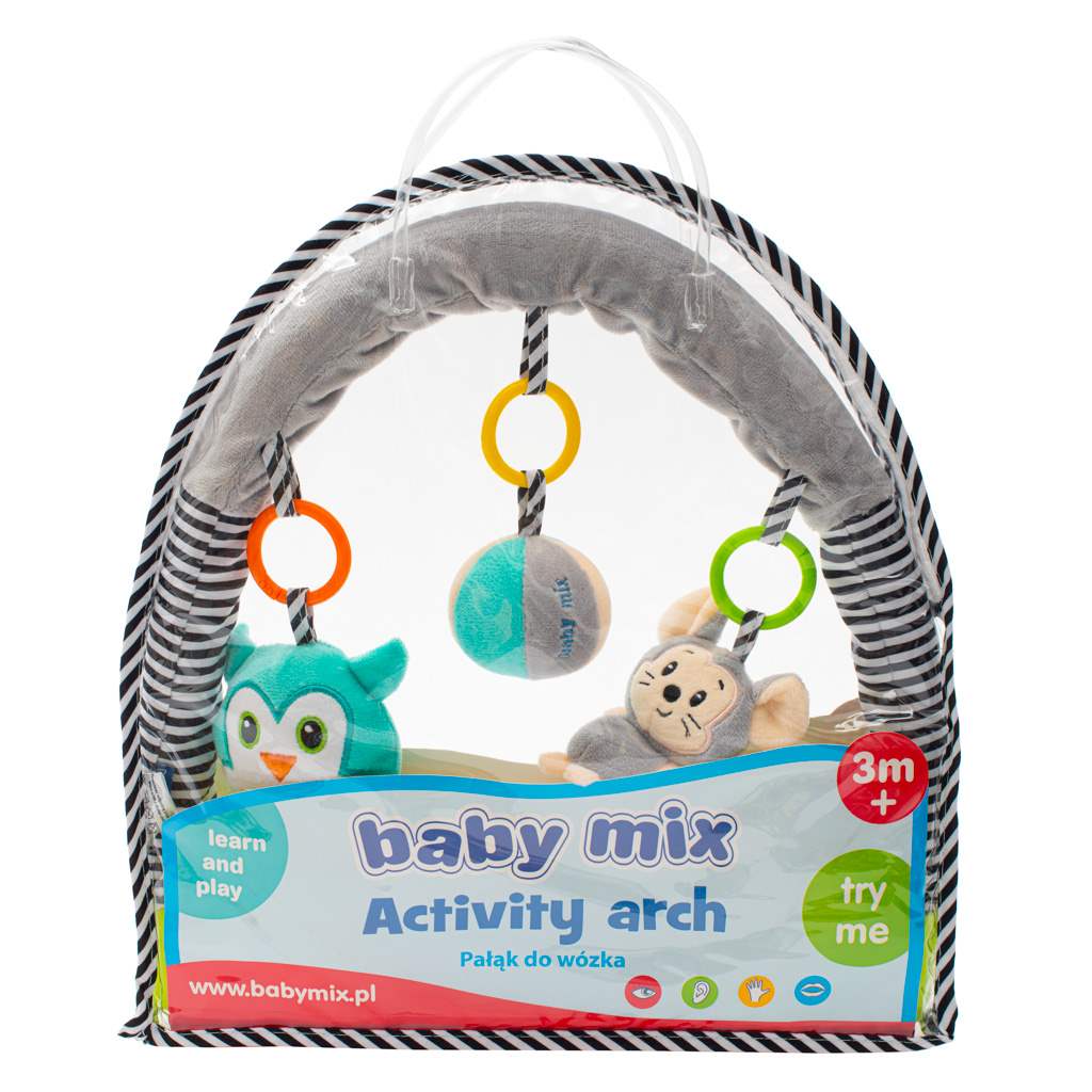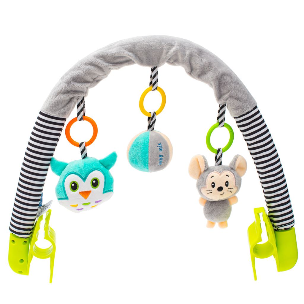 Beautiful colourful Baby Mix stroller toy tray. On the trapeze are plush toys in the shape of a mouse and an owl. The handle of the toy has two clips, which can be used to attach the toy to the stroller, recliner or car seat. The shapes and colours of the toy attract the child's attention, teach him, entertain him and thus develop the child's imagination. The toy is made of high quality and pleasant material. The height of the toy is about 12 cm. Handle length approx. 80 cm. Suitable for children from 3 months.
