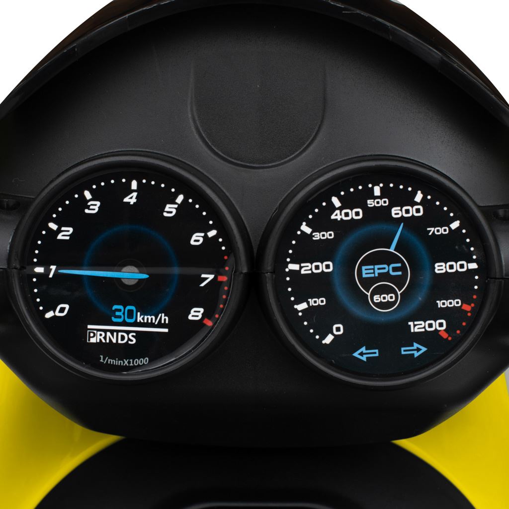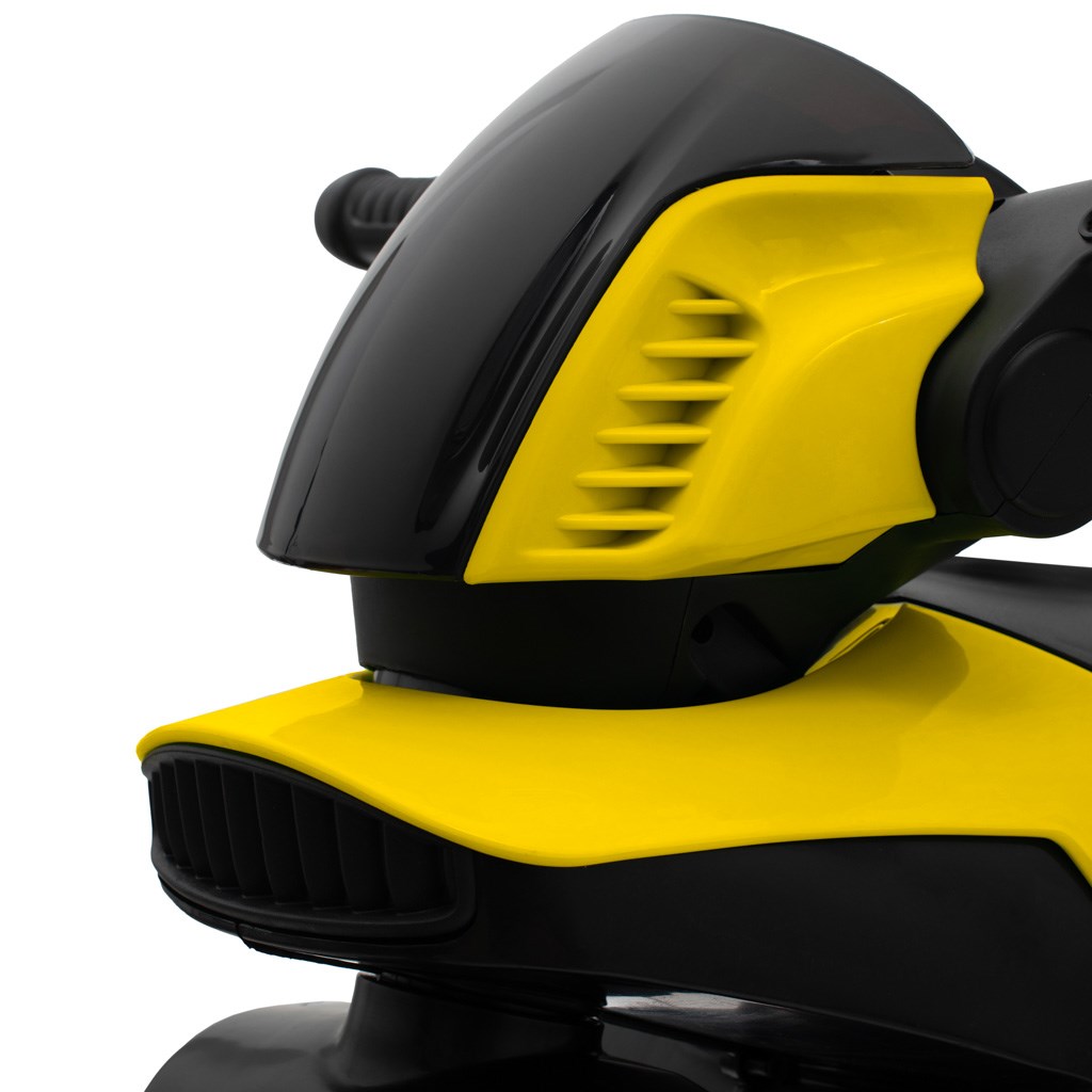 The motorcycle is controlled by pressing the foot pedal on the footrest and when it is released, the motorcycle brakes. Forward and reverse travel is controlled by toggling the reverse button. The rear wheels are driven by a pair of powerful 6V/24W motors powered by a 6V/7Ah battery.