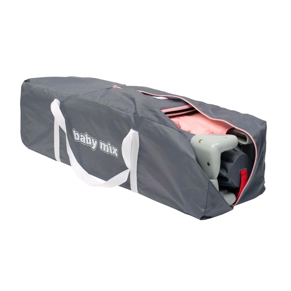 Practical portable travel cot Baby Mix serves not only as a travel cot, but also as a playpen. Enjoy time spent with your baby whenever you are on holiday or travelling. Even grandparents can enjoy the presence of their grandchildren even if they no longer have a crib. Thanks to the simple folding mechanism, the cot can be quickly and easily folded, put in the included practical bag with straps and conveniently put in the car. The cot is very lightweight and is equipped with wheels with integrated brake, so you can easily transport it to another room, balcony, terrace or garden.