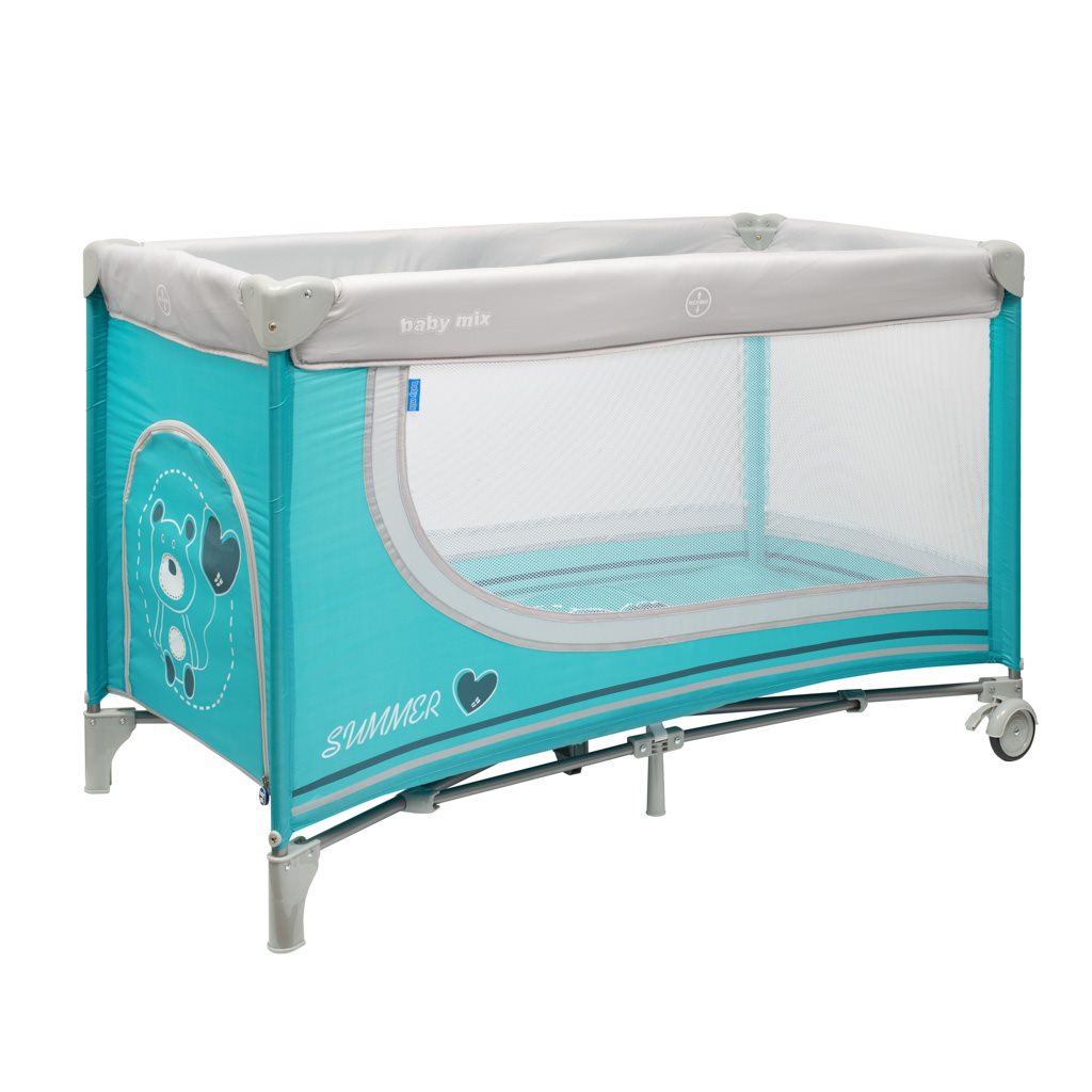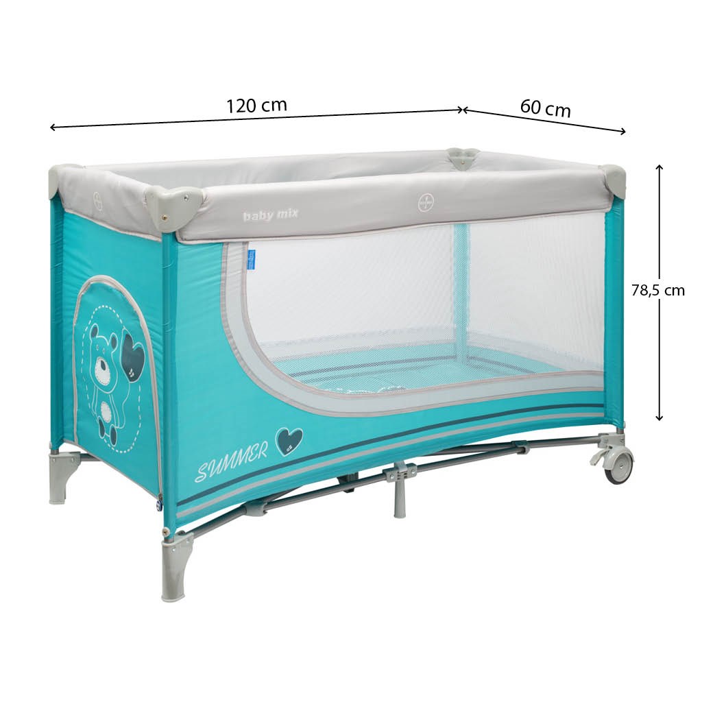 Practical portable travel cot Baby Mix serves not only as a travel cot, but also as a playpen. Enjoy time spent with your baby whenever you are on holiday or travelling. Even grandparents can enjoy the presence of their grandchildren even if they no longer have a crib. Thanks to the simple folding mechanism, the cot can be quickly and easily folded, put in the included practical bag with straps and conveniently put in the car. The cot is very lightweight and is equipped with wheels with integrated brake, so you can easily transport it to another room, balcony, terrace or garden.