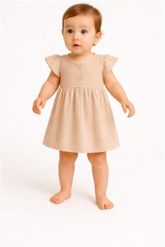 Fashionable muslin baby dresses New Baby for all little girls. The dress has short sleeves in the shape of the letter A. The bottom part has a beautifully ruffled skirt. The stud fastening on the front makes dressing easier. The dress has a very nice, soft and high quality material that is suitable for babies. They are lightweight and very comfortable to wear. Customer satisfaction is very important to New Baby and that is why we offer you our high quality summer muslin dresses.