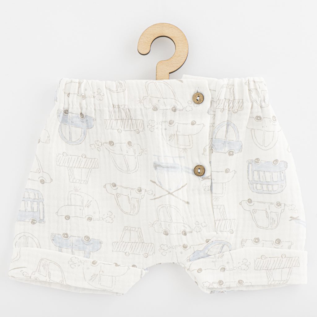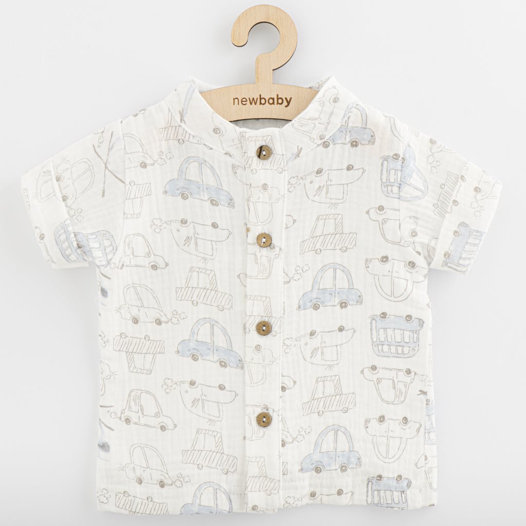 Stylish 2-piece muslin set by Czech brand New Baby My Cars for babies. Set includes shirt and shorts. The shirt with short sleeves has a button fastening. The shorts have a wider elastic waistband and fake button fastening. A beautiful, airy set for summer days for little boys. The set is lightweight and very comfortable to wear. Muslin is one of the purest, simplest and softest fabrics in the world. The finely woven breathable material is so perfect that children all over the world will love it. The lightweight texture allows the muslin to "breathe" and ensures sufficient air circulation, reducing the risk of overheating. This feature helps keep your child comfortable, safe and parents calm. The muslin is very durable, so much so that it can easily handle repeated washings and becomes lighter and softer over time. 100% cotton. 100% COTTON.