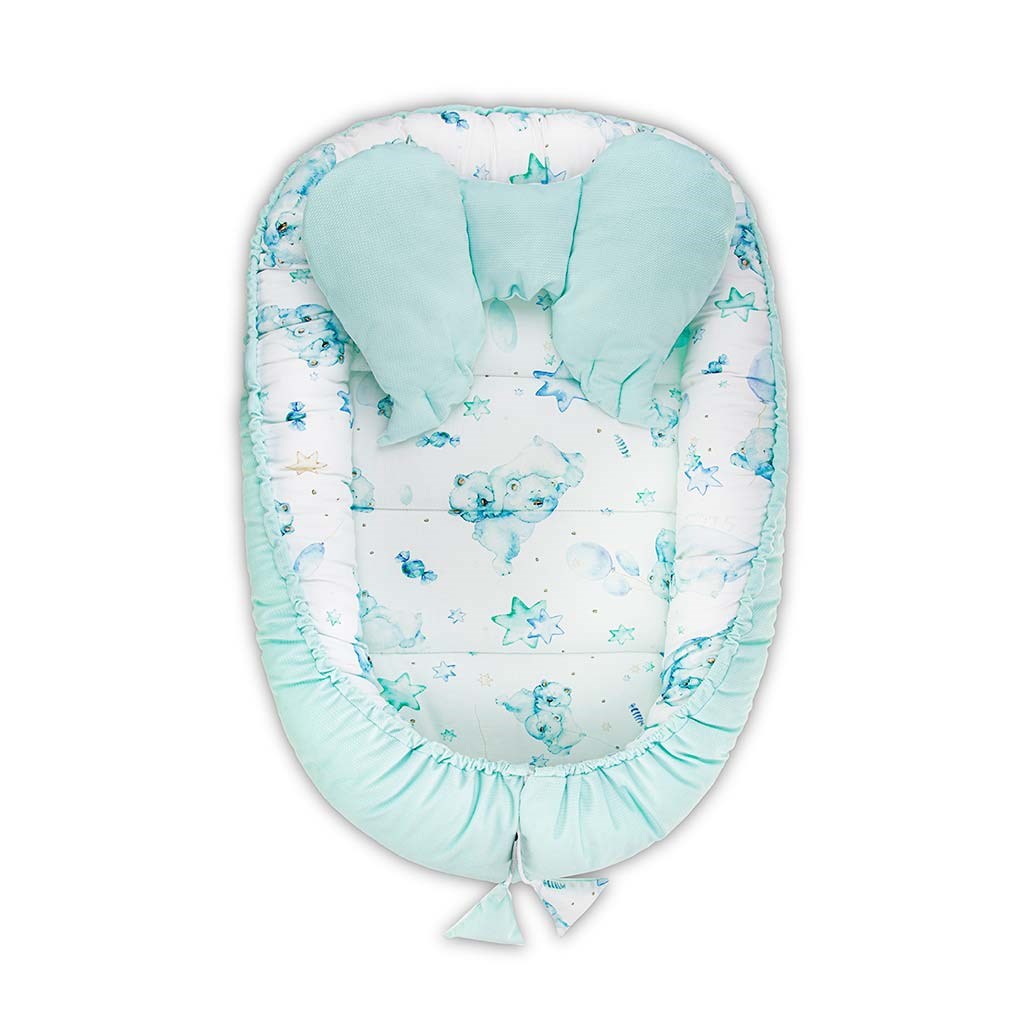 Nest for babies Velvet Sleeping bears Belisima. It gives babies a feeling of security, follows the shape of mum's body and makes the baby feel as comfortable as in mum's tummy. The nest also includes a stabilizing pillow. The baby sleeps much better and is calmer. Composition. Dimensions: approx. 55x75 cm, internal dimensions: approx. 35x59 cm.
