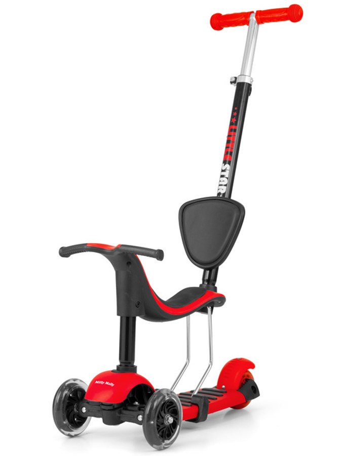 Super stylish Milly Mally Little Star kids scooter. It's not just a scooter, it's also a scooter for children from their second birthday onwards that has both a seat and a guide bar for parents. Load capacity up to 20 kg. The seat and the guide bar can be easily removed and the scooter suddenly becomes a scooter with a load capacity of up to 50 kg. It is ideal for active children who are constantly on the move. Little Star is made of high quality materials, ideal for walks and great fun. The metal construction guarantees the durability of the product. The scooter also has a brake and a mudguard on the rear wheel. Steering and twisting works on the principle of body balance. The big advantage of the scooter is the 3 wheels that provide stability and safety. Children will also enjoy the front wheels that light up during the ride. Little Star is 3in1, comfort and simplicity in a modern form.