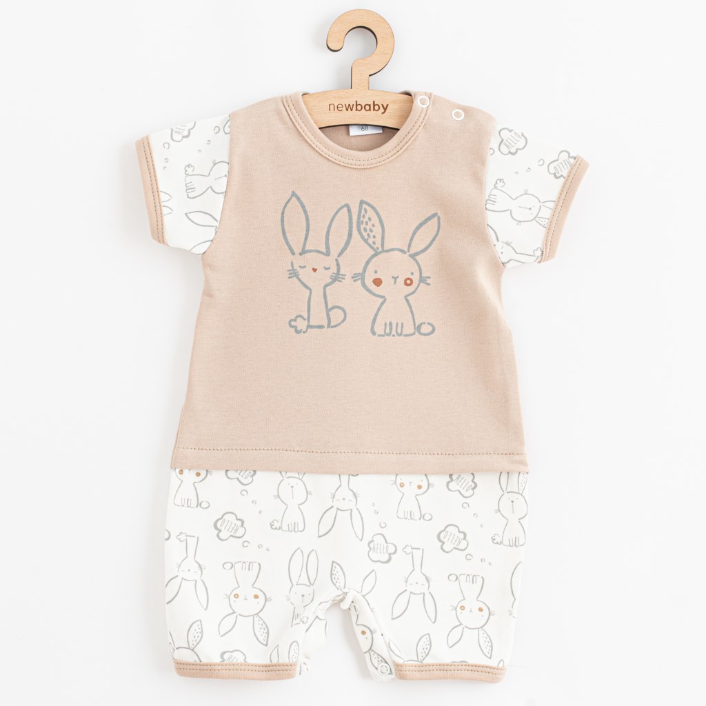 Stylish summer cotton jumpsuit with short sleeves by Czech brand New Baby Rabbit friends. The jumpsuit is decorated with a print of bunnies. It has a practical stud fastening on the shoulder and between the legs, which makes dressing and changing easier. The playful summer jumpsuit will brighten up all babies. 100% cotton.