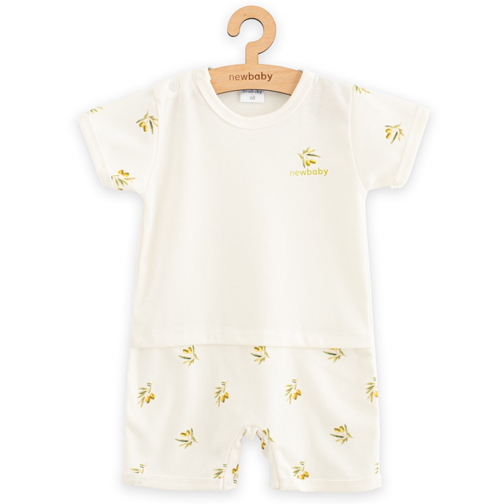 Stylish summer jumpsuit with short sleeves New Baby Olives. The wrap short sleeve jumpsuit is printed all over with beautiful olives. It has a practical lace-up fastening on the side, on the inside with a stud and between the legs with studs which makes dressing and changing easier. There are soft elastic bands on the legs but they do not press on the feet.