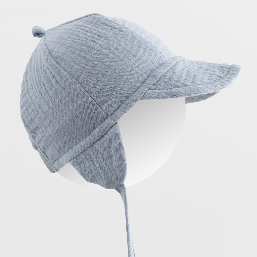 Summer muslin cap with New Baby. The cap protects the head from the strong sun and thanks to the visor, which makes a shadow does not burn the face and protects the baby's eyes from the sun. It is beautifully shaped on the ears, ties with laces, does not press and will hold well on the baby's head. Muslin is one of the purest, simplest and softest fabrics in the world. The finely woven breathable material is so perfect that babies all over the world will love it. The lightweight texture allows the muslin to "breathe" and ensures sufficient air circulation, reducing the risk of overheating. This feature helps keep your child comfortable, safe and parents calm. The muslin is very durable, so much so that it can easily handle repeated washings and becomes lighter and softer over time. 100% cotton. OEKO-TEX STANDARD 100.