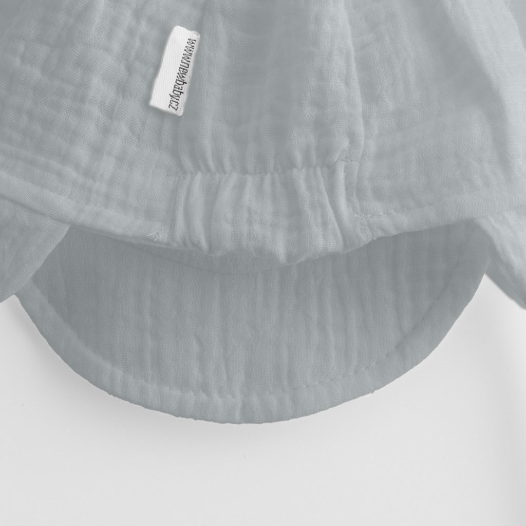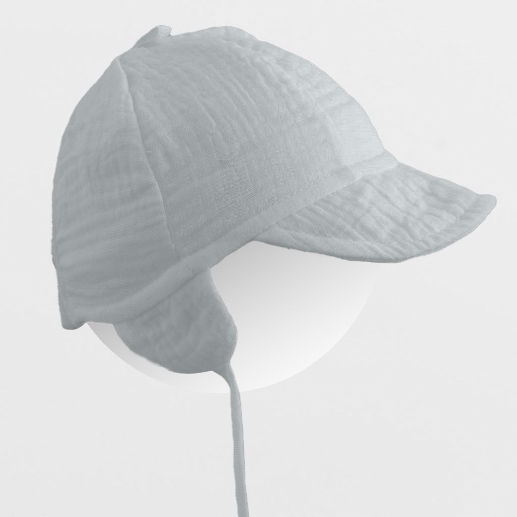 Summer muslin cap with New Baby. The cap protects the head from the strong sun and thanks to the visor, which makes a shadow does not burn the face and protects the baby's eyes from the sun. It is beautifully shaped on the ears, ties with laces, does not press and will hold well on the baby's head. Muslin is one of the purest, simplest and softest fabrics in the world. The finely woven breathable material is so perfect that babies all over the world will love it. The lightweight texture allows the muslin to "breathe" and ensures sufficient air circulation, reducing the risk of overheating. This feature helps keep your child comfortable, safe and parents calm. The muslin is very durable, so much so that it can easily handle repeated washings and becomes lighter and softer over time. 100% cotton. OEKO-TEX STANDARD 100.