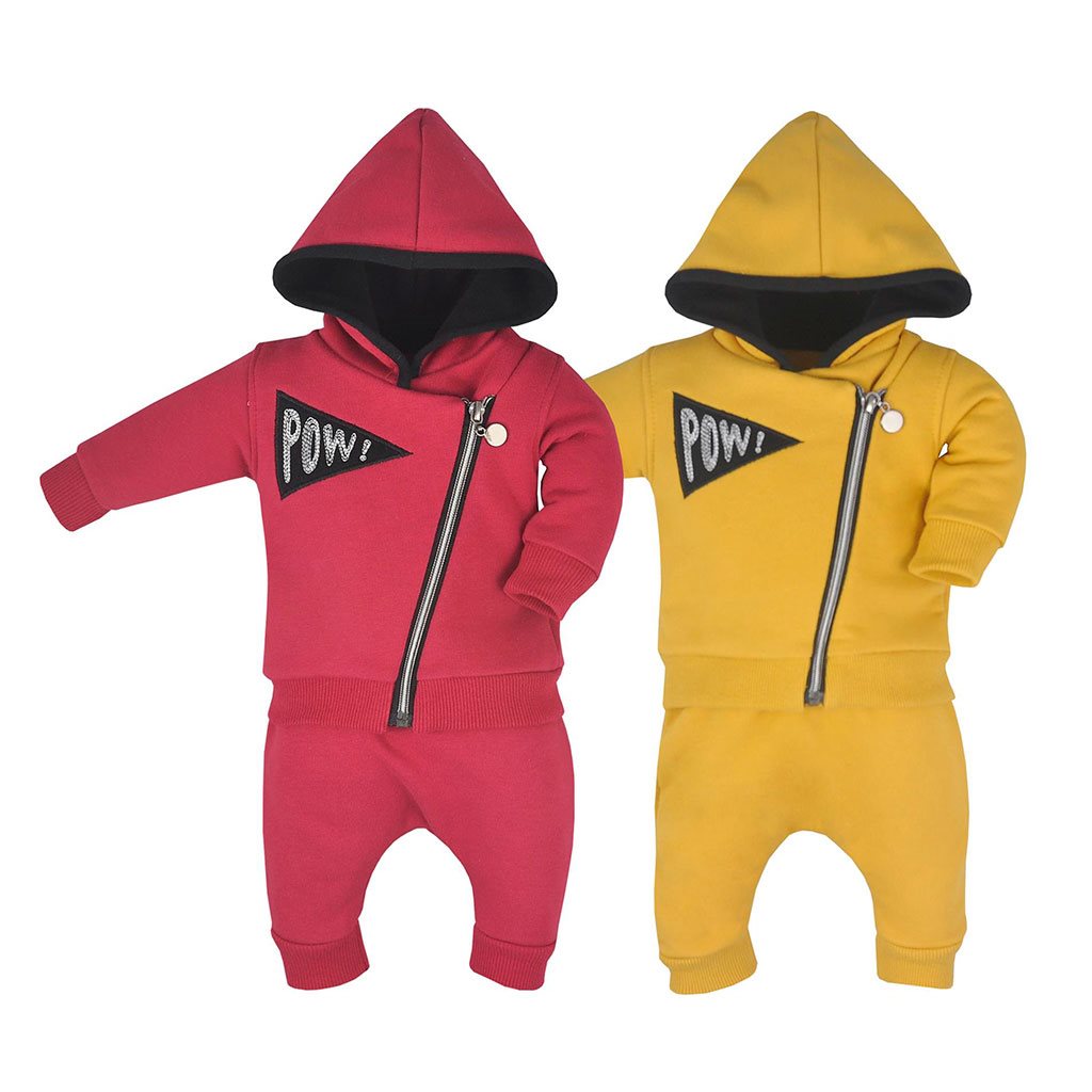 Original and stylish 2-piece set Koala Pow. The set includes sweatpants and hoodie. The hoodie has a modern side zip fastening, beautiful colour and a hood with cotton lining. It has a wide hem around the arms and waist. The sweatpants have a wide hem on the legs and have a stylish dropped seat giving just the right amount of sizzle. The set is great for the stroller, car seat, walks or as a comfortable outfit for home. It has a versatile use. The set is made of a very pleasant, soft material and is very well made. 96% cotton, 4% elastane.