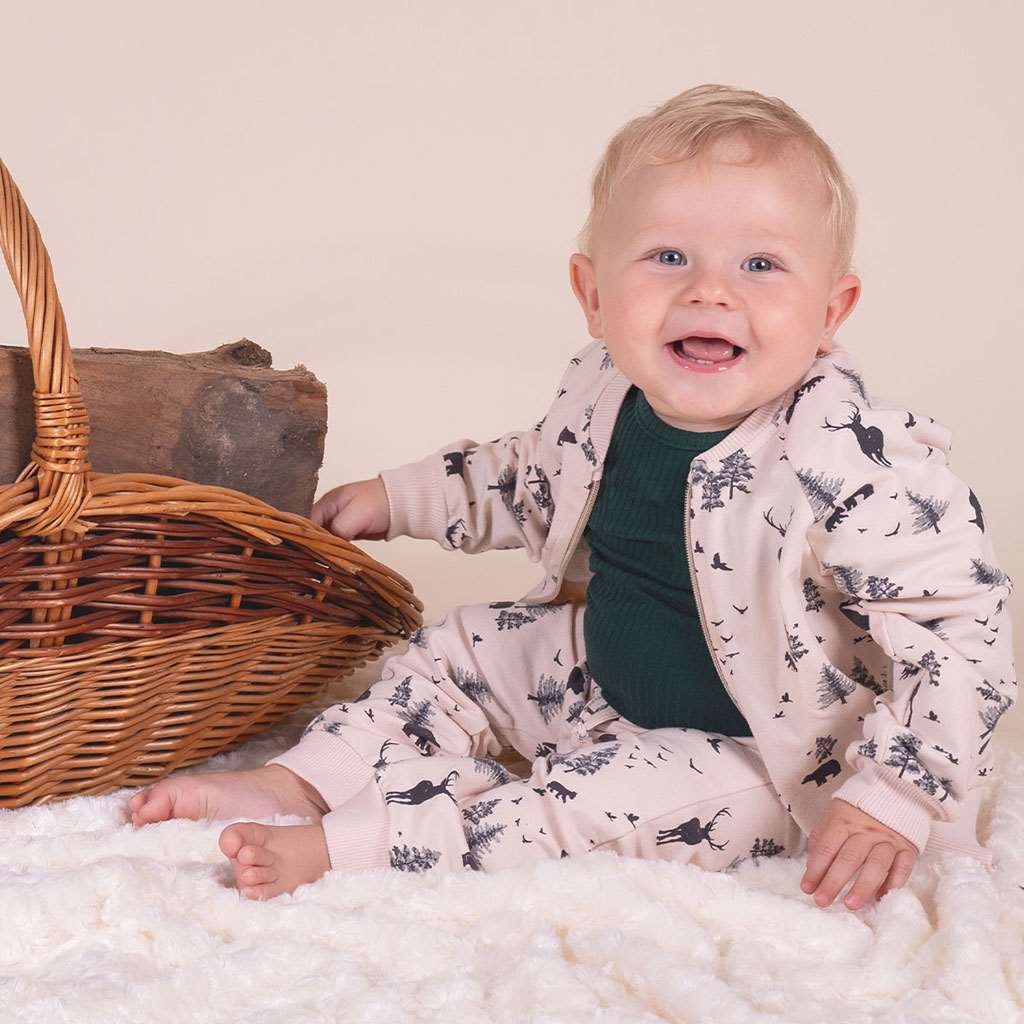 Beautiful Nicol Bambi cotton sweatpants for babies decorated with a forest motif. They have a wide drawstring waist and legs. Bambi is a new breathtaking collection designed with the needs of our little ones in mind. 95% cotton, 5% elastane. OEKO-TEX STANDARD 100.
