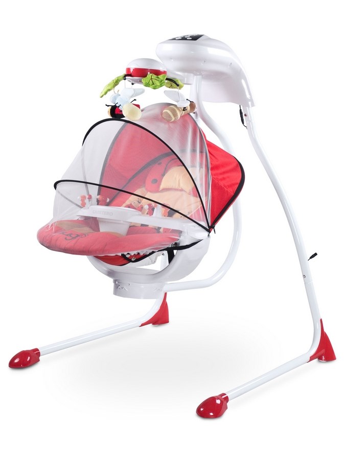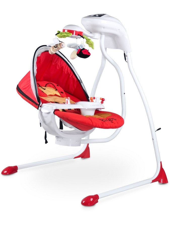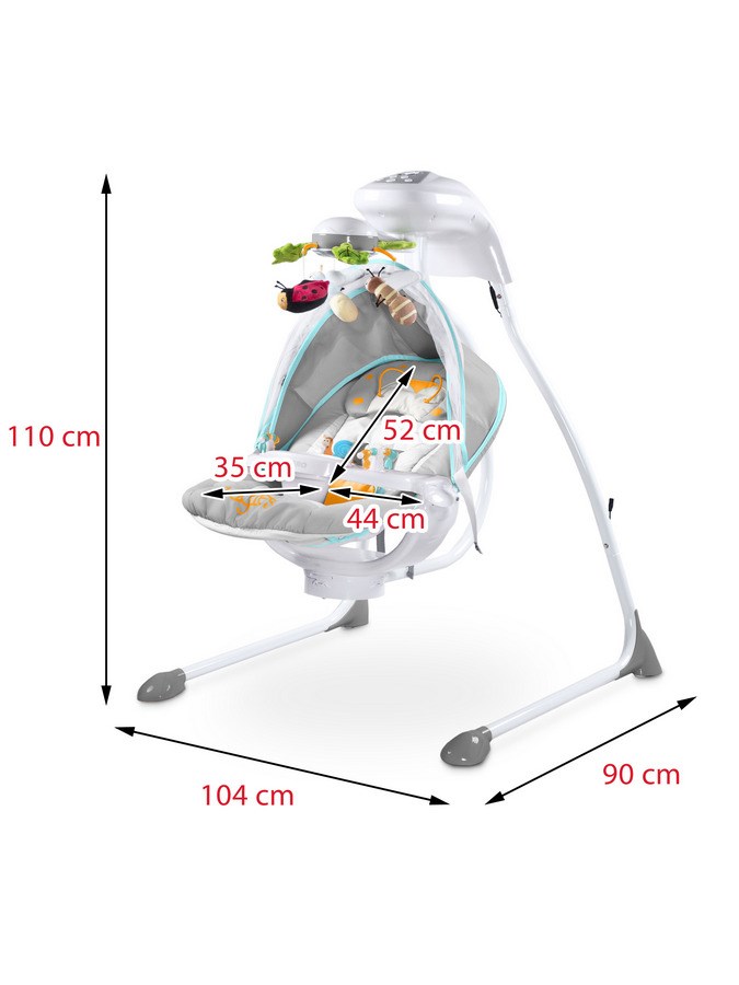 Beautiful and practical CARETERO Bugies swing. The swing can be easily folded and does not take up much space. It includes a carousel with toys and melody, a canopy with mosquito net, thanks to which you can use the swing in the garden or on the terrace. The swing can be adjusted to 2 positions and the seat rotates 90°, all this will ensure comfort for your baby during play and rest. Quality material, metal construction and safety belts guarantee safety for your baby. The swing is suitable for children up to 12 kg.