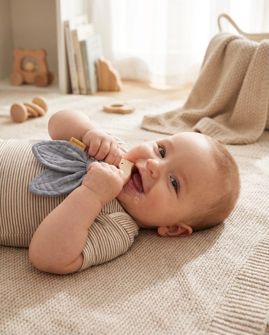 The teether with a muslin diaper is the perfect set when a baby is teething. The teether is made of center-friendly beech wood and soft muslin cloth. Completely safe for infants brings soothing relief during teething. The teether can also be used as a toy for babies. The teether fits perfectly with our other muslin products to create a beautiful set that can be gifted for a Baby Shower.
