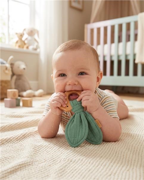 The teether with a muslin diaper is the perfect set when a baby is teething. The teether is made of center-friendly beech wood and soft muslin cloth. Completely safe for infants brings soothing relief during teething. The teether can also be used as a toy for babies. The teether fits perfectly with our other muslin products to create a beautiful set that can be gifted for a Baby Shower.
