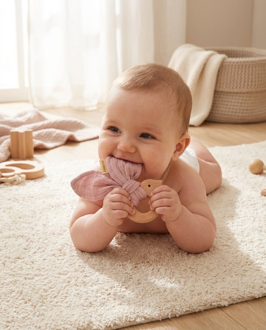 The teether with a muslin diaper is the perfect set when a baby is teething. The teether is made of center-friendly beech wood and soft muslin cloth. Completely safe for infants brings soothing relief during teething. The teether can also be used as a toy for babies. The teether fits perfectly with our other muslin products to create a beautiful set that can be gifted for a Baby Shower.