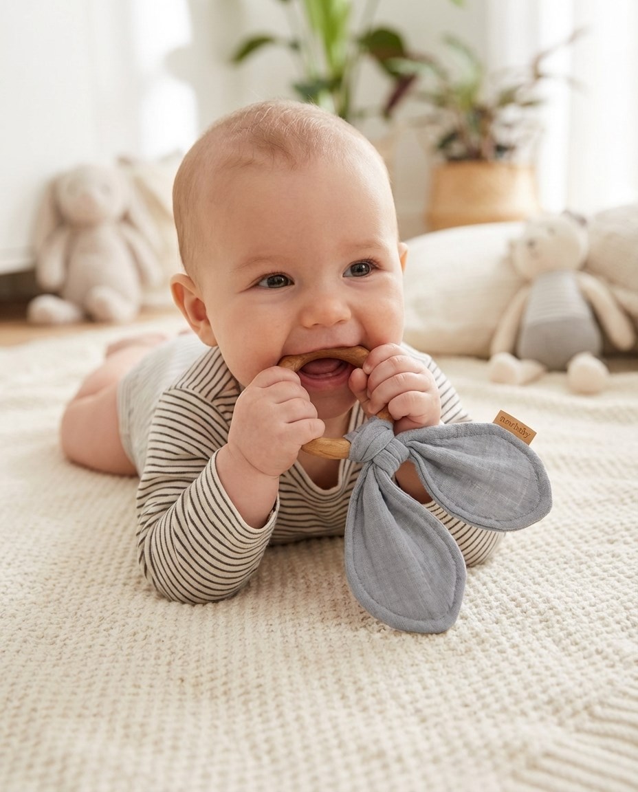 The teether with a muslin diaper is the perfect set when a baby is teething. The teether is made of center-friendly beech wood and soft muslin cloth. Completely safe for infants brings soothing relief during teething. The teether can also be used as a toy for babies. The teether fits perfectly with our other muslin products to create a beautiful set that can be gifted for a Baby Shower.