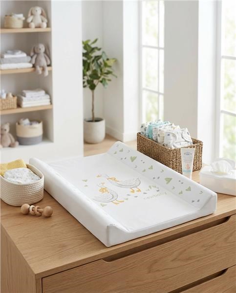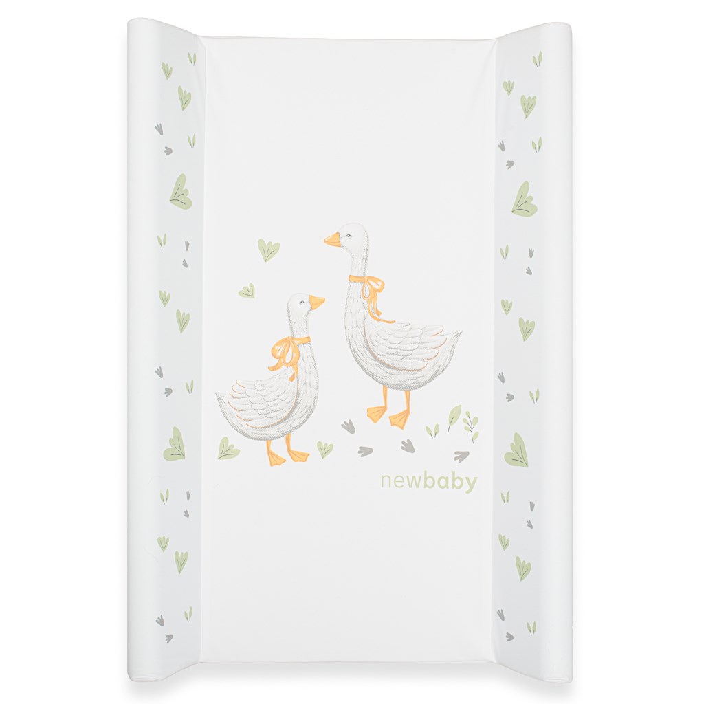 Practical shaped changing mat New Baby made of waterproof plastic material with geese image in pleasant pastel colours.