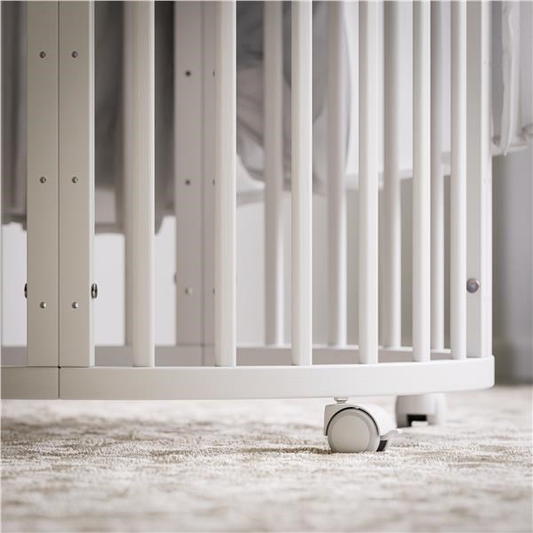The crib turns into a playpen. The rounded shape allows the child to safely learn to stand and crawl.
