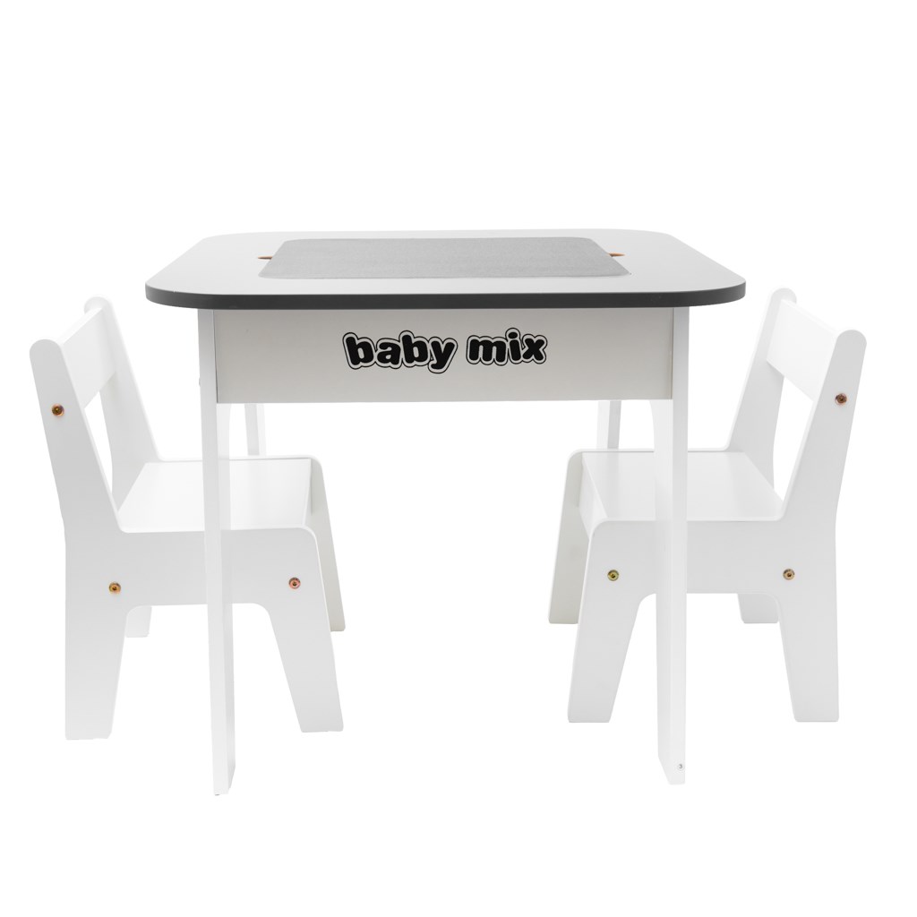 The set includes a table and two chairs made from durable materials that ensure stability and long-lasting use. The table is equipped with a practical removable tabletop – underneath is a storage compartment where crayons, paper, small toys, or building blocks can be easily stored. This keeps everything within reach while helping children maintain order.