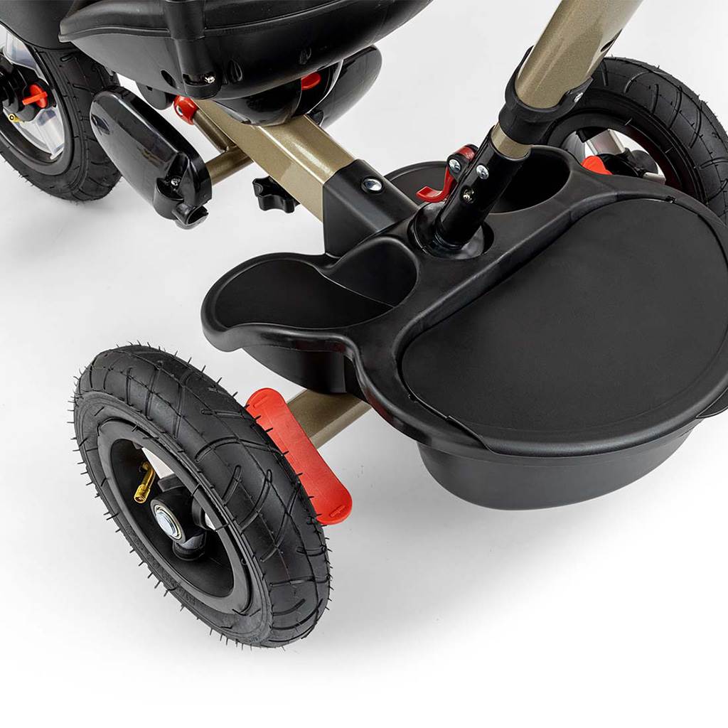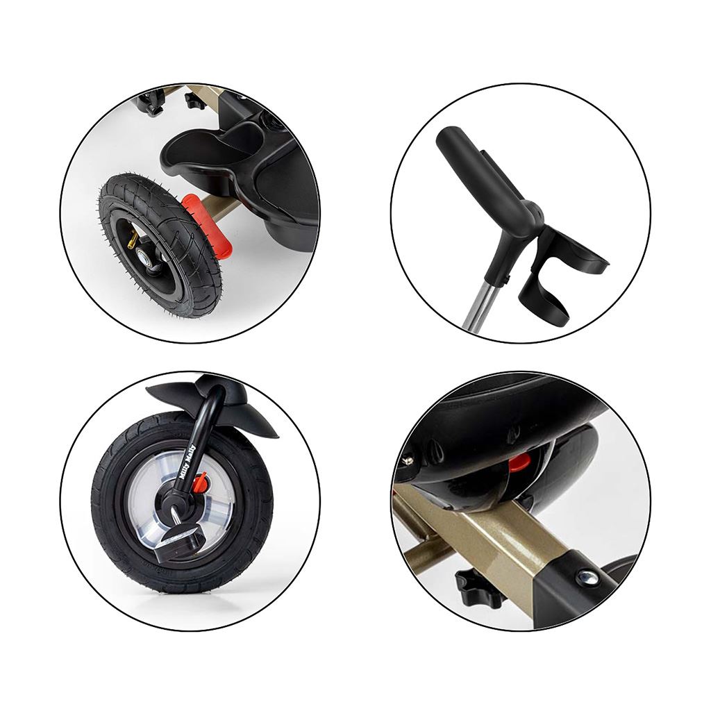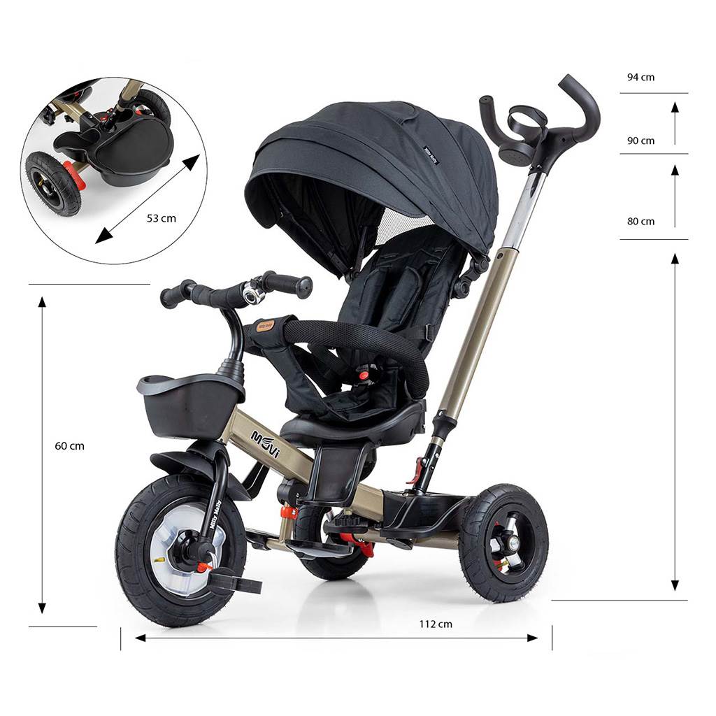 It is made of high quality and durable materials. It has a modern design, a comfortable and ergonomically shaped seat that swivels 360 degrees, allowing the child to travel in or against the direction of travel. Comfort and safety during the ride is ensured by a barrier, three-point seat belts, comfortable footrests or large inflatable wheels that absorb shocks and provide good grip. Both child and parent can control the trike with the adjustable push handle. When the guide bar, the folding canopy that protects from the sun or other components are removed, it will serve as a tricycle. The tricycle can also be used as an alternative to a golf buggy. There is a handy storage basket for toys or baby's necessities.