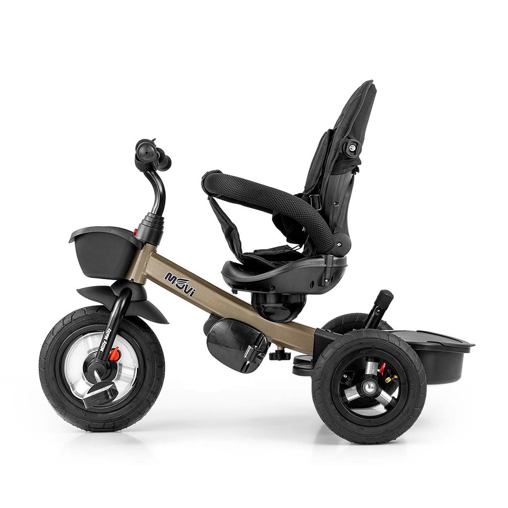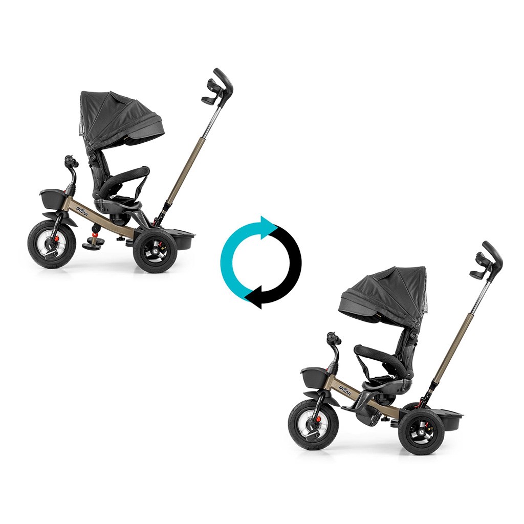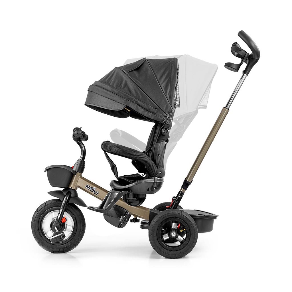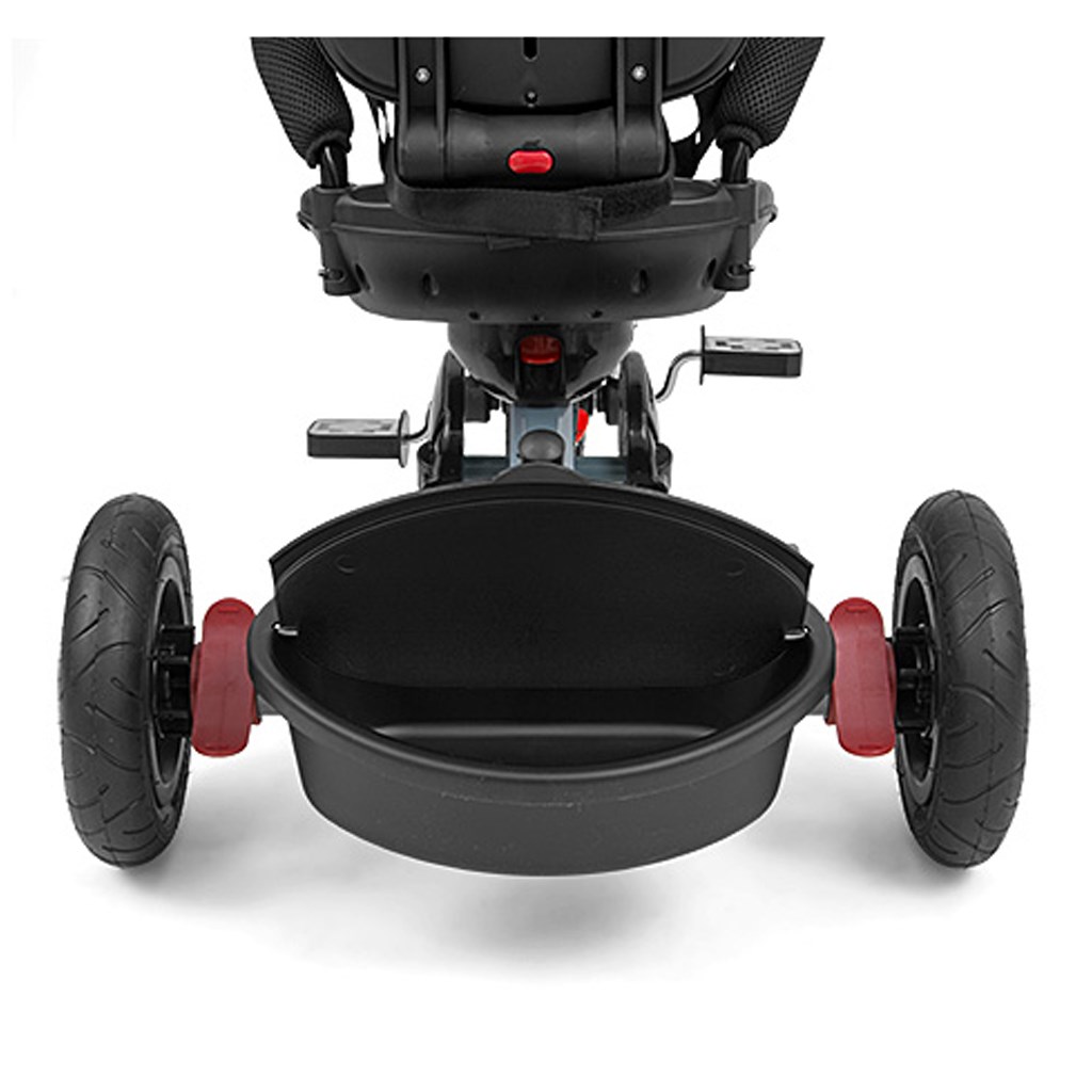 It is made of high quality and durable materials. It has a modern design, a comfortable and ergonomically shaped seat that swivels 360 degrees, allowing the child to travel in or against the direction of travel. Comfort and safety during the ride is ensured by a barrier, three-point seat belts, comfortable footrests or large inflatable wheels that absorb shocks and provide good grip. Both child and parent can control the trike with the adjustable push handle. When the guide bar, the folding canopy that protects from the sun or other components are removed, it will serve as a tricycle. The tricycle can also be used as an alternative to a golf buggy. There is a handy storage basket for toys or baby's necessities.