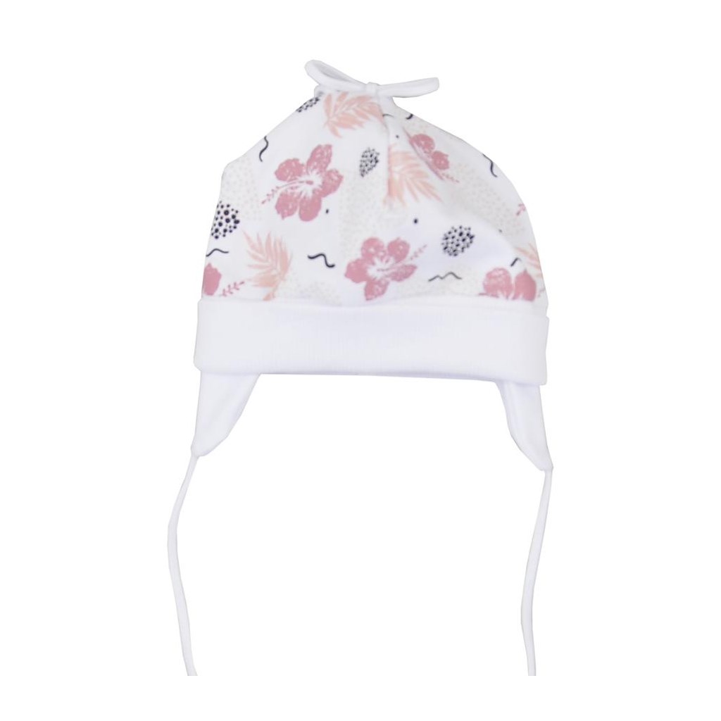 Beautiful cap Koala Flowers. It has a stretchy, drawstring hem that does not press and will hold well on the baby's head. It is beautifully shaped for the ears and ties with laces. The cap is decorated with a beautiful print. 100% cotton.