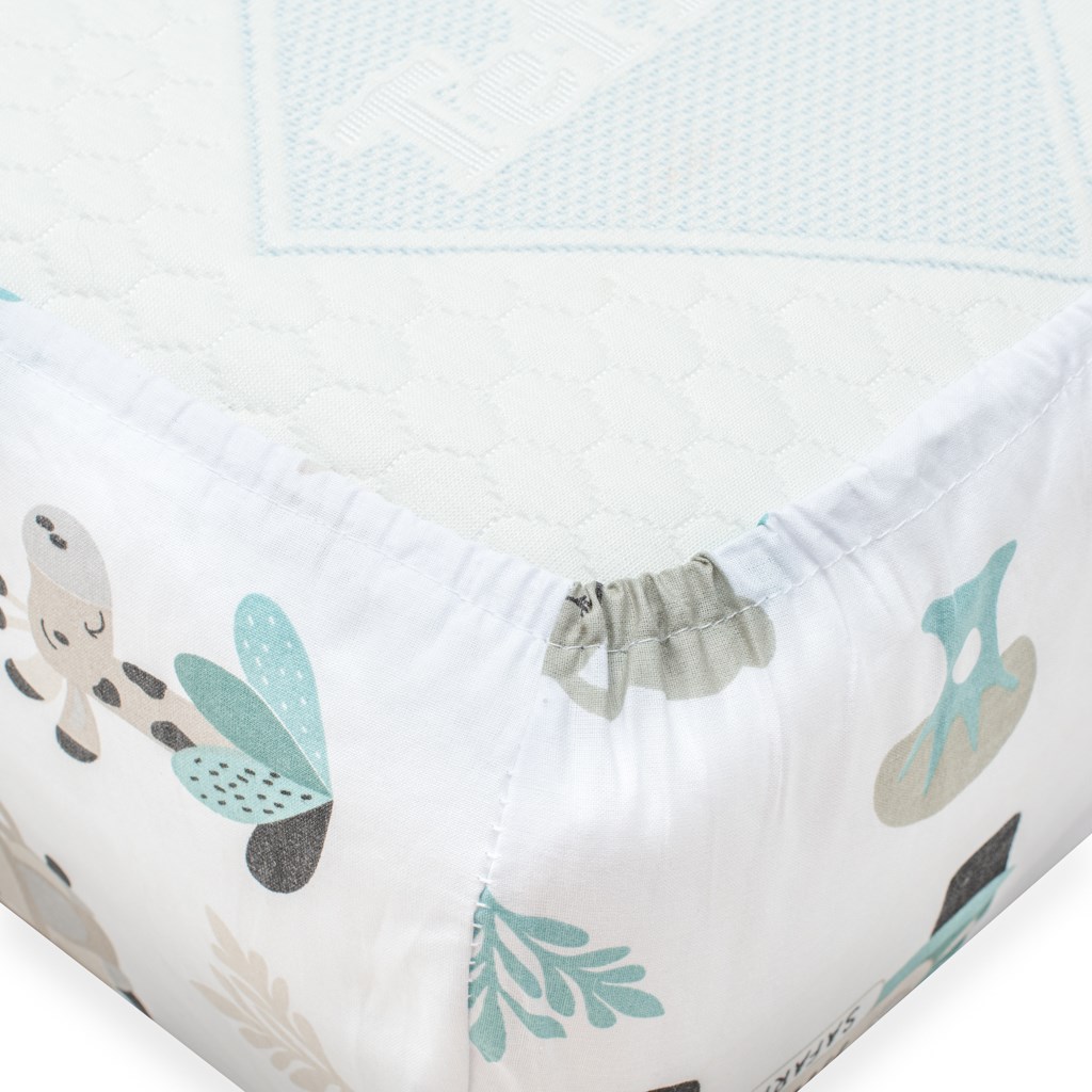 The New Baby Safari cotton sheet is made of smooth and pleasant to the touch cotton fabric. The beautiful baby motif will please baby's little eyes. The sewn-in elastic prevents the sheet from slipping off the mattress, guarantees the correct tension of the sheet and allows it to adapt to any shape. The sheet is suitable for mattresses with dimensions 120x60 cm. The sheet is a classic cotton sheet that is not elastic and therefore has dimensions of 90x150 cm, so that it fits beautifully on the whole mattress and on the underside.