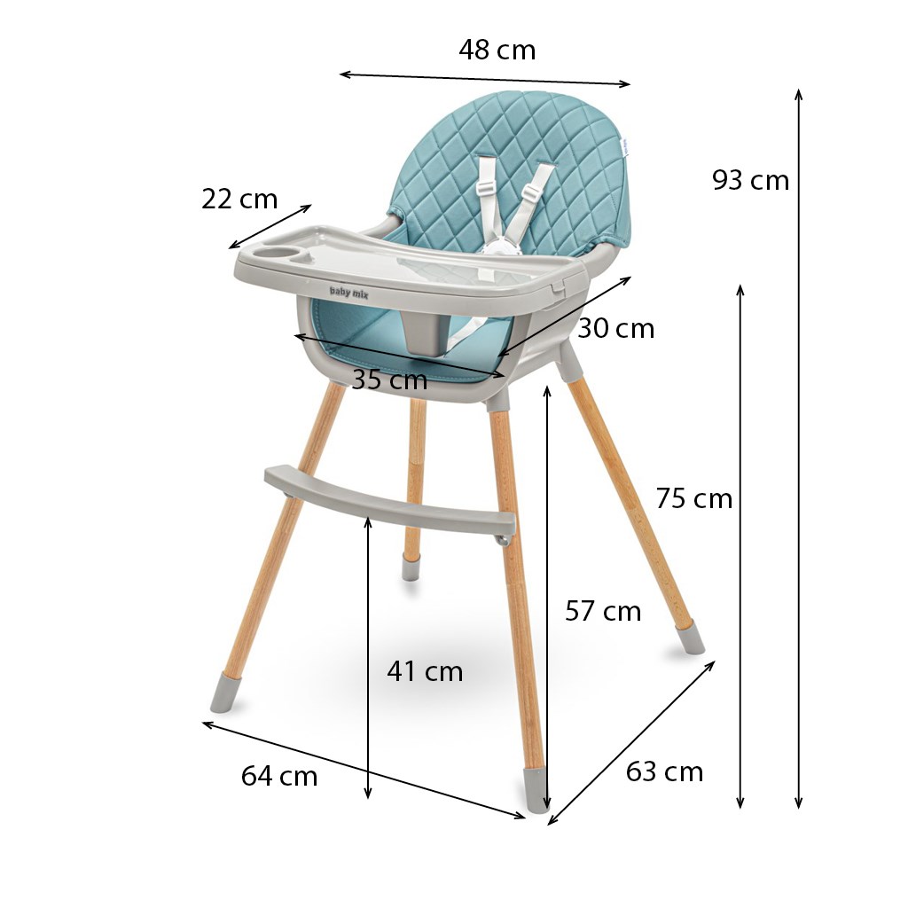 The Baby Mix highchair has all the features that make everyday feeding easier: adjustable double tray, 5-point harness, removable eco-leather upholstery, footrest, fabric basket, non-slip feet. The chair can be easily converted into a low chair by removing the bottom of the legs.The Baby Mix highchair is suitable for children aged 6-36 months.