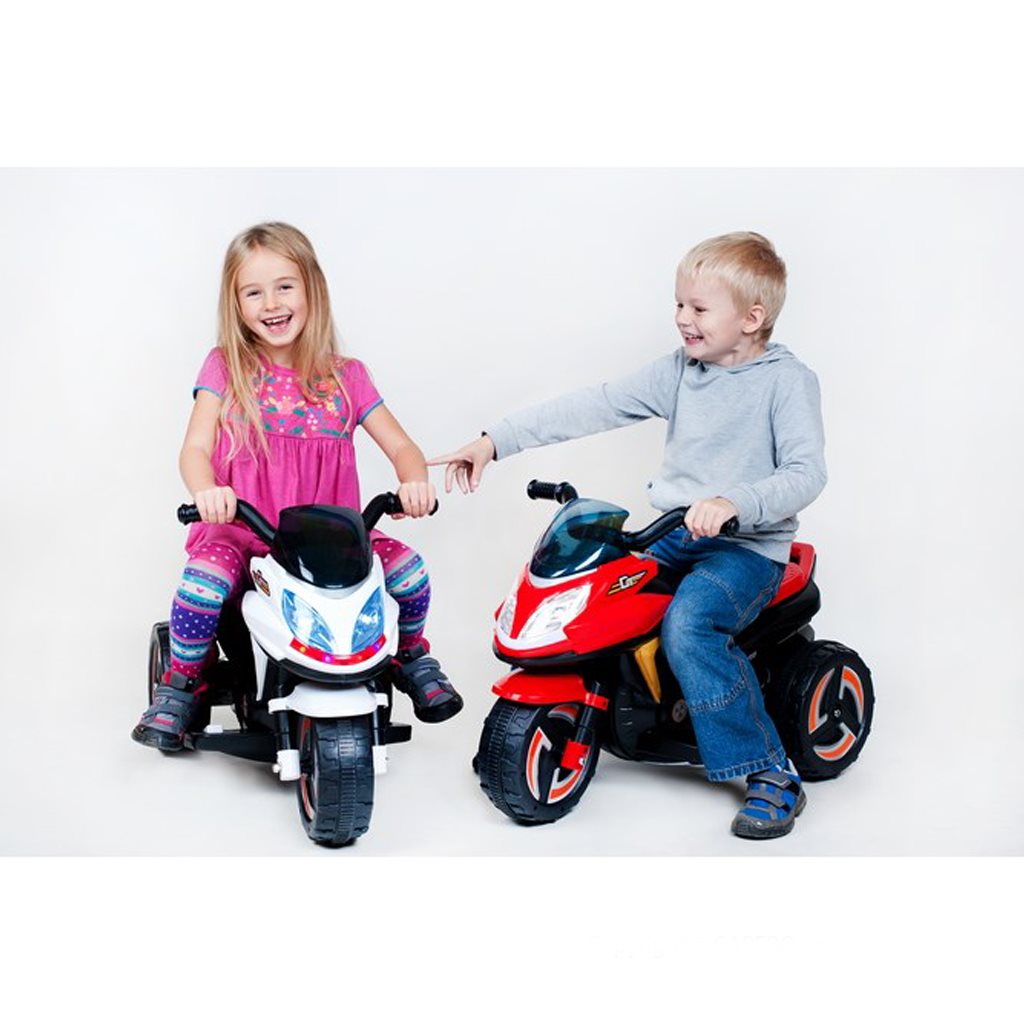 Children's motorcycle BAYO KICK. Motorcycle rides great and has one engine. It rides by pressing the pedal on the footrest. The direction of travel is determined by the forward (Forward)/backward (Backward) button on the handlebars. The bike has many features like a button to turn on the vehicle and a button with melodies. Quality wheels, solid and quality construction, all this is a guarantee of safety for your children. The battery is easily charged with the charger. You will have a lot of fun with the bike. The colour of the wheels varies according to the current offer.