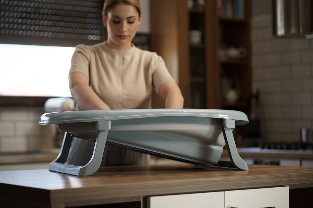The bath is equipped with a drain plug and a strip thermometer, significantly enhancing comfort and safety during everyday use. It can be folded down to a height of just 10 cm, with the plastic legs folding neatly under the bath – saving space and making it ideal for storage even in smaller rooms.