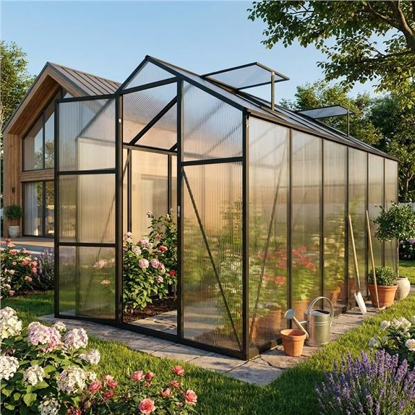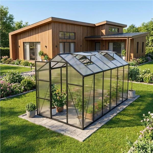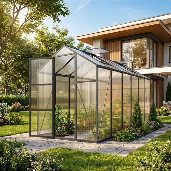 This practical and durable polycarbonate garden greenhouse is the ideal choice for anyone who wants to extend the growing season and provide plants with optimal growing conditions. Thanks to its sturdy aluminum frame, reinforced panels, and well-designed ventilation system, the greenhouse offers reliable year-round use.