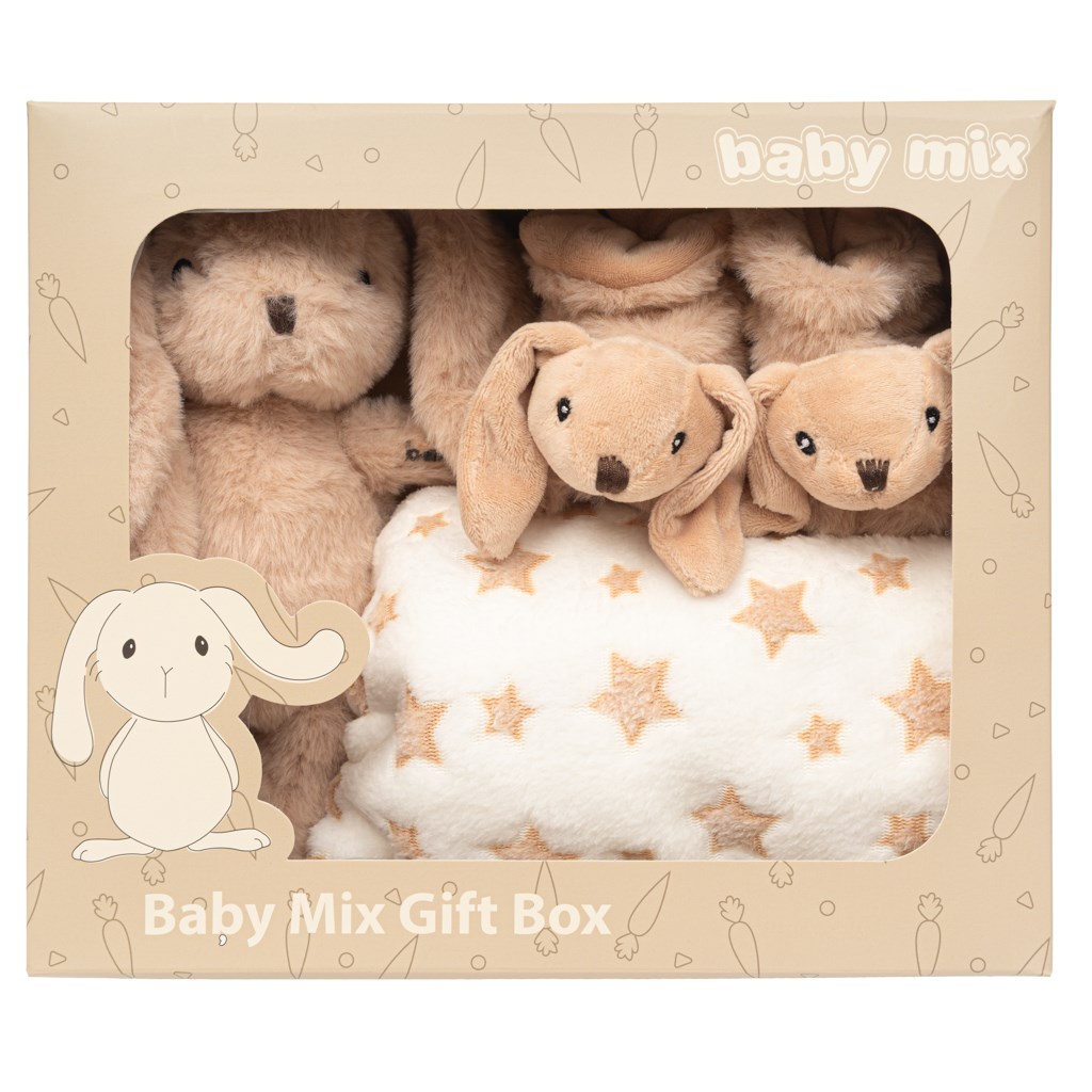 This adorable Baby Mix gift set is the ideal present for a newborn or infant – combining warmth, softness and unique charm. The set includes a brown plush bunny, a soft blanket sized 70 × 70 cm and sweet booties with a length of 10 cm, together forming a cozy and harmonious duo.
