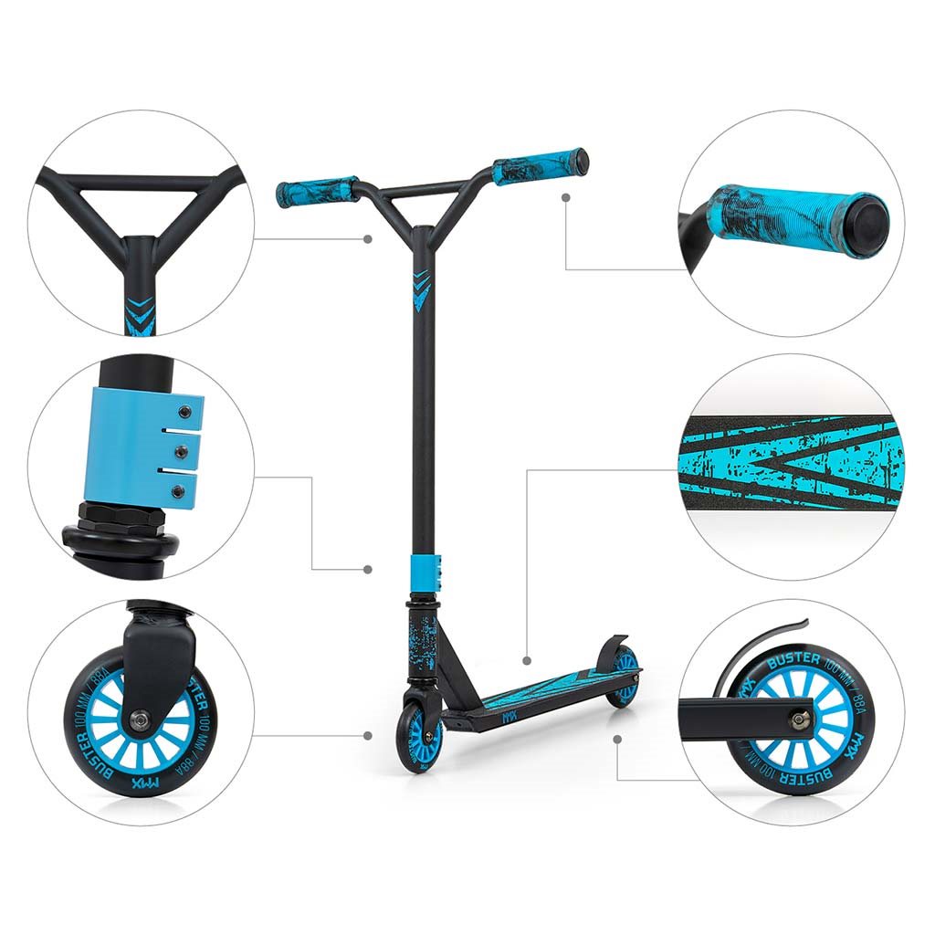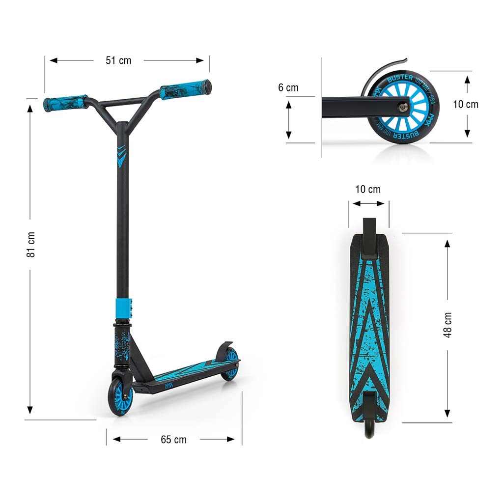 Freestyle scooters are made of the highest quality materials to ensure the highest level of safety during freestyle riding. The construction of the BUSTER scooter is a combination of aluminium and steel, resulting in low weight while maintaining sufficient rigidity and the highest durability. BUSTER is the optimal equipment for beginners and intermediate users. Wide handlebars with reinforced construction and rubberized handles made of durable TPR thermoplastic rubber ensure a firm grip that guarantees safety when performing stunts and tricks. The scooter's tread plate is made of aluminium, covered with a non-slip surface and finished with a FLEX BRAKE tread brake. The wheels are made of the highest quality PU with a nylon core and ABEC-7 bearings - this combination guarantees durability, quality and safety for those starting their freestyle scooter adventure.