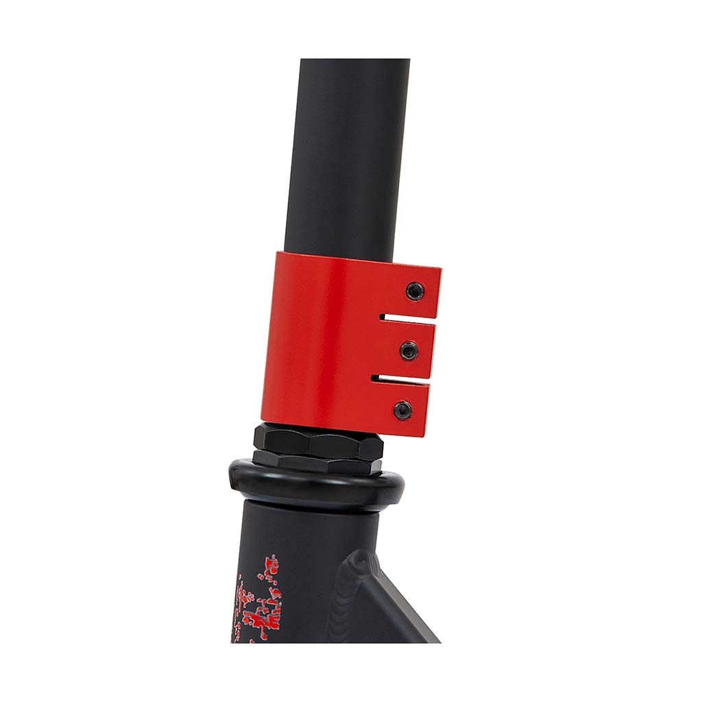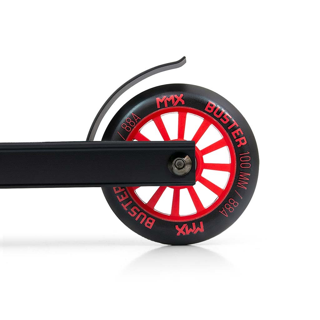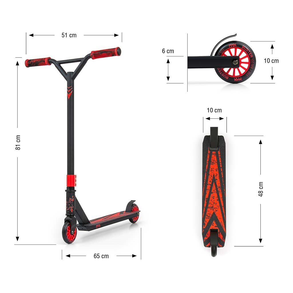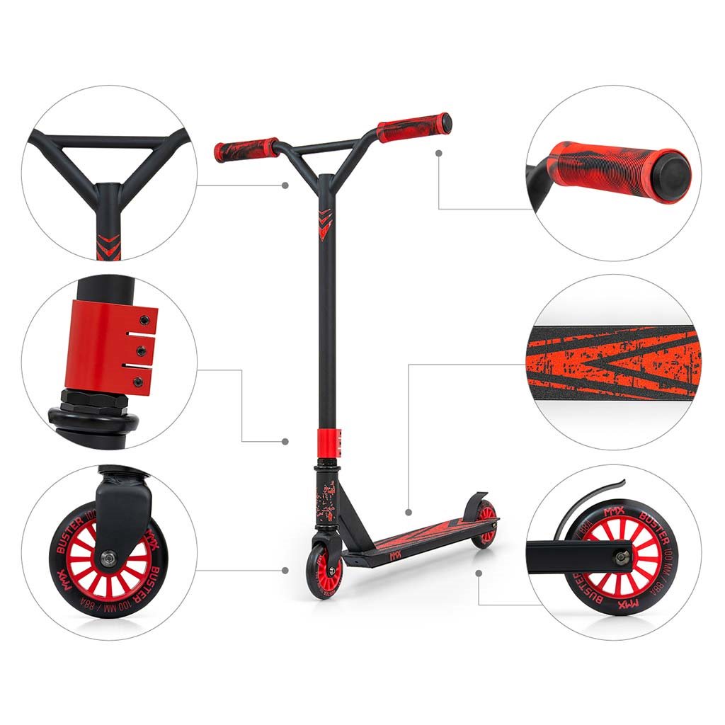 Freestyle scooters are made of the highest quality materials to ensure the highest level of safety during freestyle riding. The construction of the BUSTER scooter is a combination of aluminium and steel, resulting in low weight while maintaining sufficient rigidity and the highest durability. BUSTER is the optimal equipment for beginners and intermediate users. Wide handlebars with reinforced construction and rubberized handles made of durable TPR thermoplastic rubber ensure a firm grip that guarantees safety when performing stunts and tricks. The scooter's tread plate is made of aluminium, covered with a non-slip surface and finished with a FLEX BRAKE tread brake. The wheels are made of the highest quality PU with a nylon core and ABEC-7 bearings - this combination guarantees durability, quality and safety for those starting their freestyle scooter adventure.