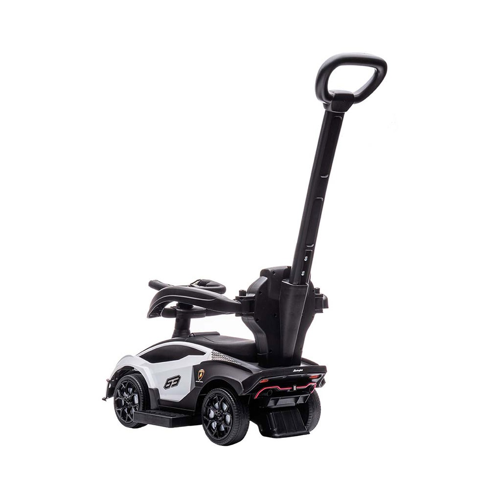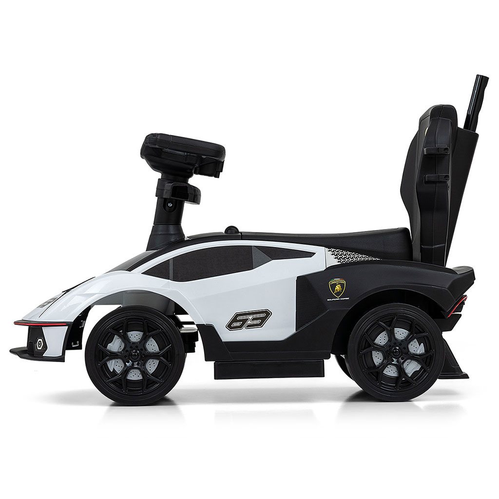 Licensed by Lamborghini and Lamborghini Bull and Shield - Italian brand of luxury cars and supercars. The car is made with great attention to the smallest details and the quality of the materials used. The car is a faithful replica of the Essenza SC V12 - which has been called a hypercar.The car, like its prototype, is a combination of sporty design, predatory character and capabilities. The vehicle is made of the highest quality materials, which are characterised by high durability and safety (used in the production of accessories and toys for children).The multifunctionality of the vehicle allows for many years of use. Thanks to the additional possibilities, the toy will not get tired quickly and by playing the child will develop his manual skills and motor skills. An interactive steering wheel is included - which makes the fun even more interesting! The product has swivel wheels that can be easily controlled by the parent using the handle. This translates into comfort when walking around. The barriers and handle are very easy to assemble and disassemble. The steel axles of the wheels ensure stability and durability of the ride. On the other hand, the tyres made of PVC, a thermoplastic material characterised by great flexibility and durability, allow it to be used on all surfaces without damage or scratches. The profiled seat and barrier system provide high comfort and safety for the smallest users - even a child older than 12 months can use the bike. Additional protection - located underneath the carriage (in the rear) protects older children from tipping over during faster rides.The possibility of detaching individual elements allows the carriage to be adapted to the child's current needs, skills and stages of development, allowing the carriage to ""grow"" with the child.