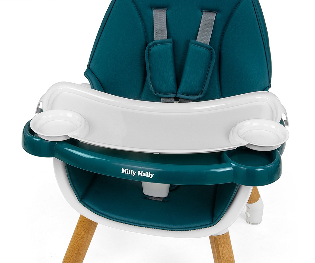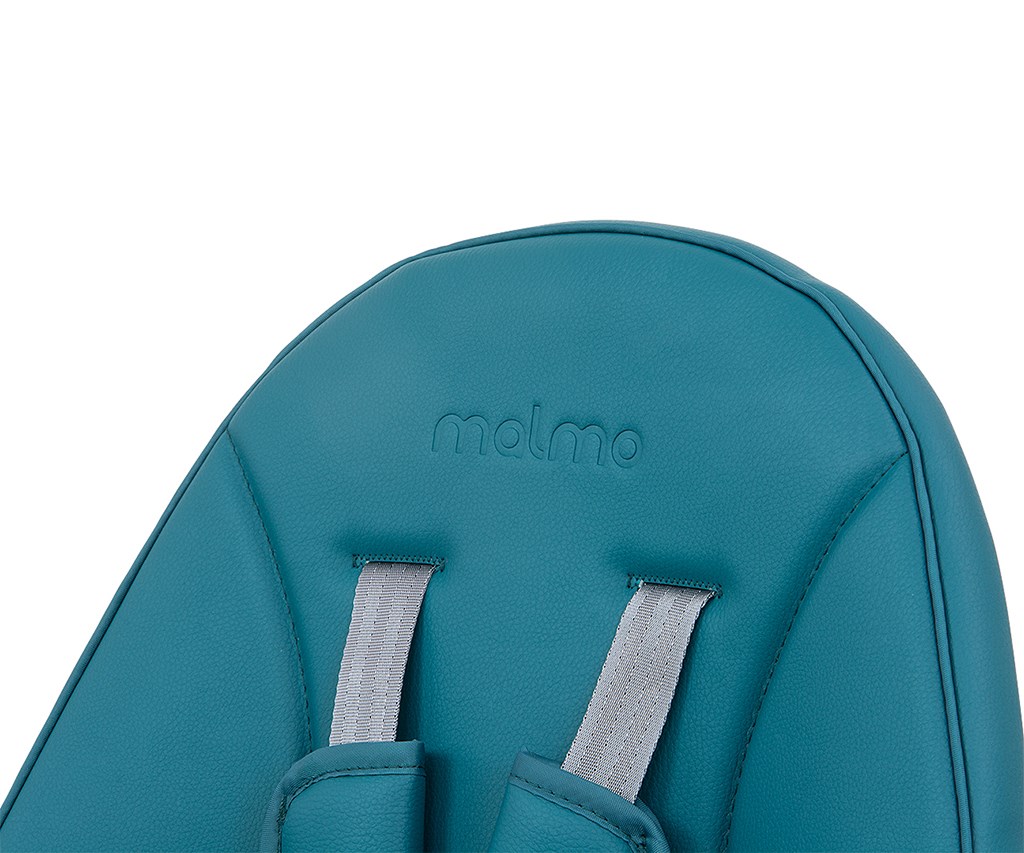The five-point seat belt with wide and soft shoulder pads protects the child from abrasions. The Malmo chair's eco-leather upholstery is stain-resistant and easy to clean. The tray has a depression that prevents objects from slipping.