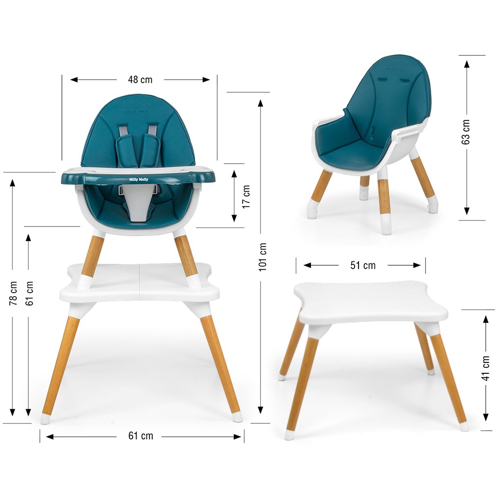 Modern and stylish 2in1 Malmo children's highchair. It is made of the highest quality materials - combining functionality and modern design. The high chair version is designed for children from 6 months to 36 months or when they reach a weight of 15 kg, and the low chair plus table version for children from 3 to 6 years or when they reach a weight of 25 kg.