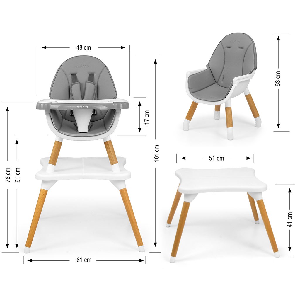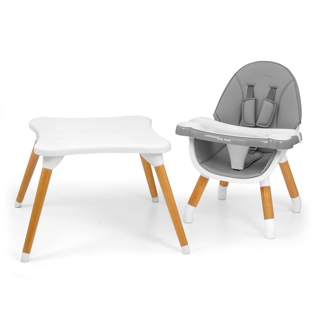 Modern and stylish 2in1 Malmo children's highchair. It is made of the highest quality materials - combining functionality and modern design. The high chair version is designed for children from 6 months to 36 months or when they reach a weight of 15 kg, and the low chair plus table version for children from 3 to 6 years or when they reach a weight of 25 kg.