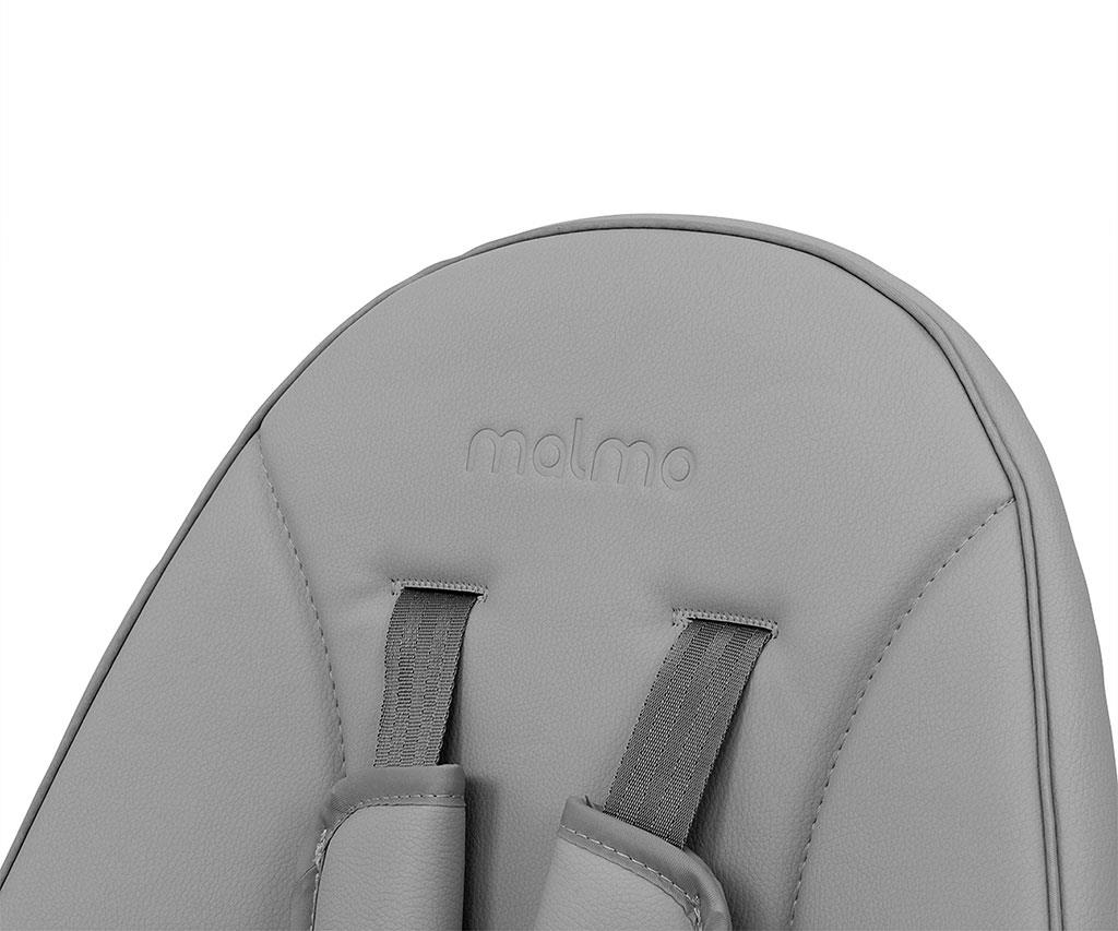The five-point seat belt with wide and soft shoulder pads protects the child from abrasions. The Malmo chair's eco-leather upholstery is stain-resistant and easy to clean. The tray has a depression that prevents objects from slipping.