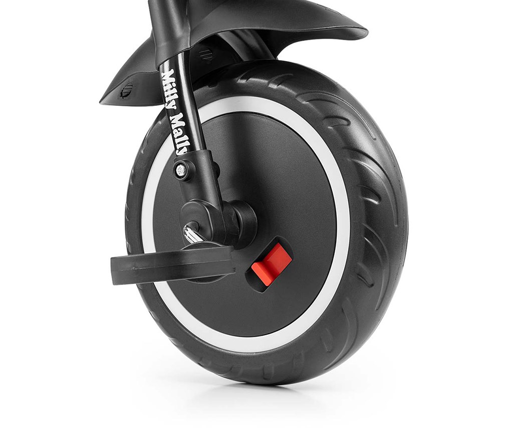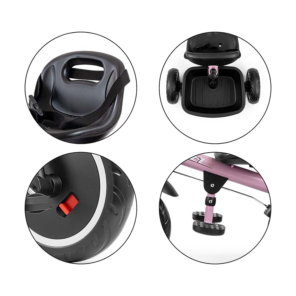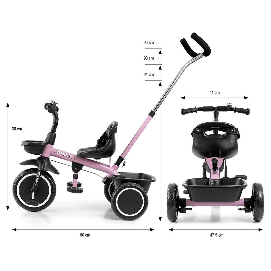 Children's pedal tricycle with handle Axel is designed for children aged from 1 to 3 years. It is made of high quality and durable materials. It has a comfortable and ergonomically shaped saddle whose distance to the handlebars can be easily adjusted, thus adapting the tricycle to the age and height of the child. The tricycle belongs to the GROW UP product group, i.e. it grows with the child. The pedal drive can be released on the front wheel and the guide bar can be used to push the little racer when he runs out of energy. The wide wheels, made of hardened EVA foam, guarantee comfort and durability on any surface. Stack all the toys your little racer needs in the two handy baskets and set off on an adventure. The combination of metal construction and components made from the highest quality materials guarantees durability in all conditions. For maximum child safety, the tricycle has seat belts.