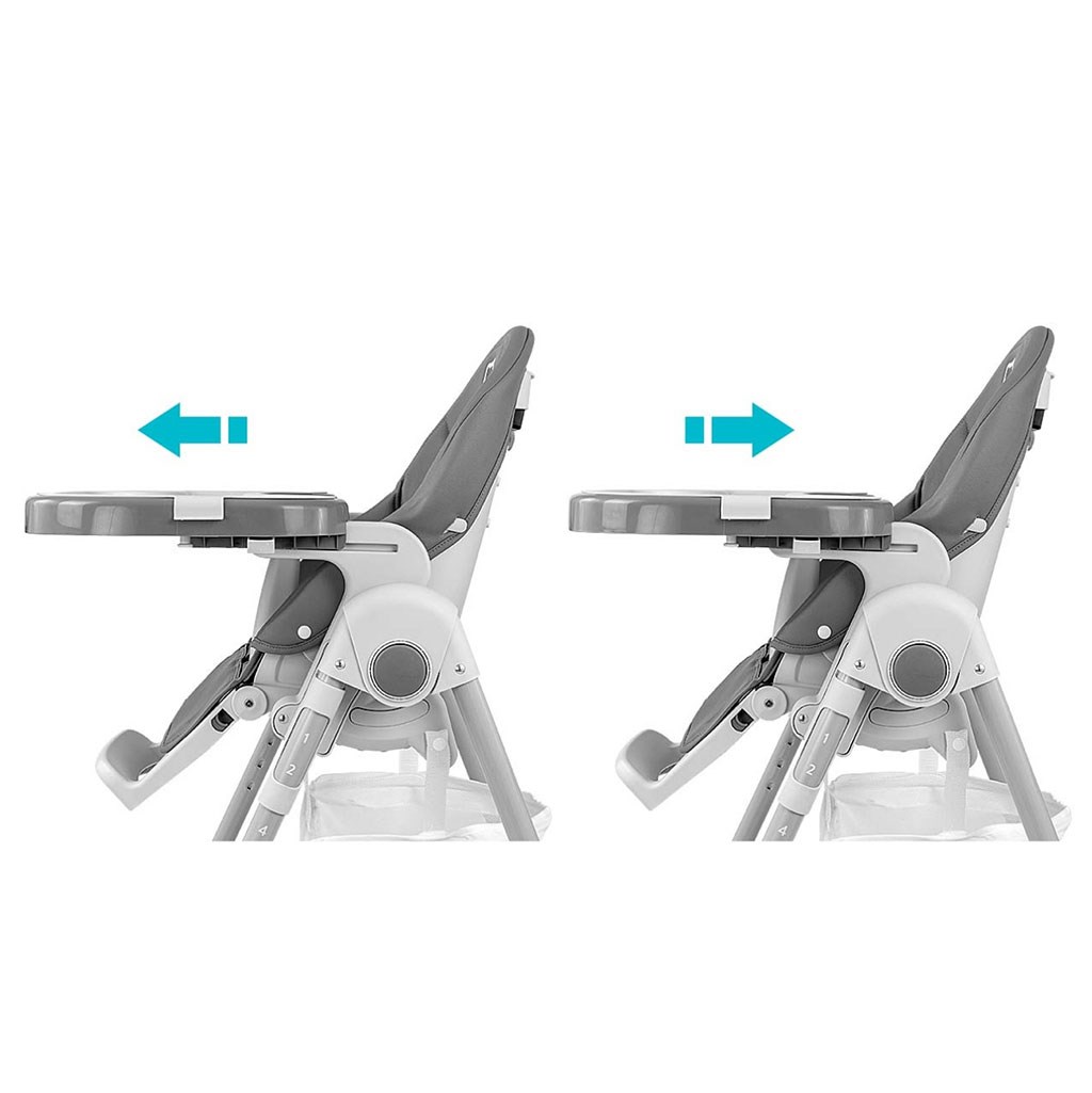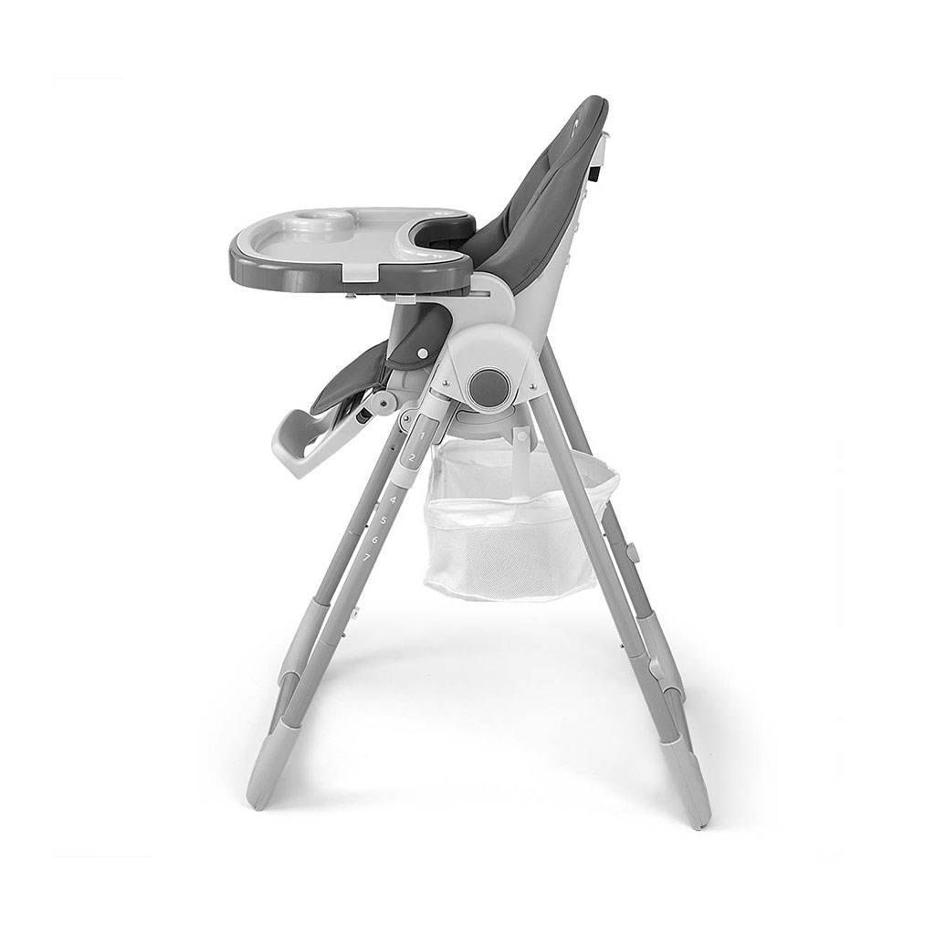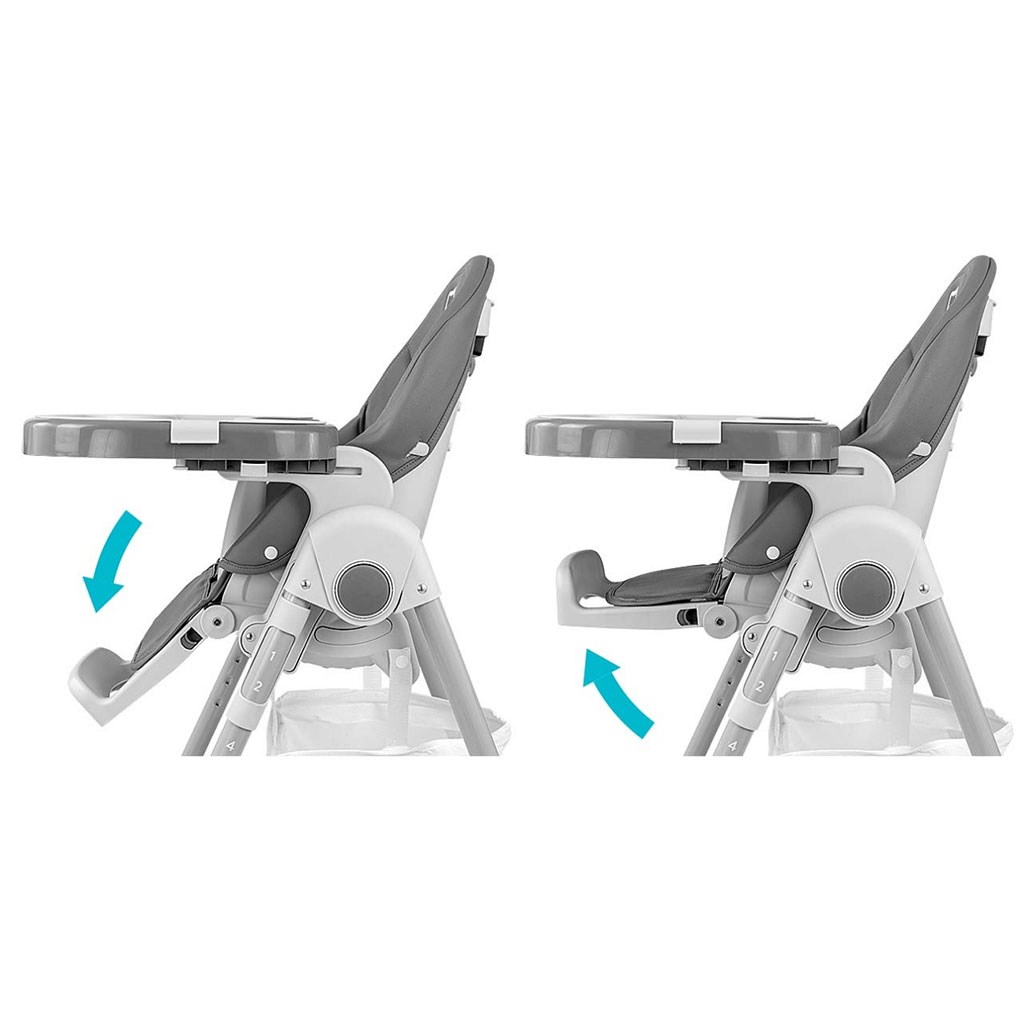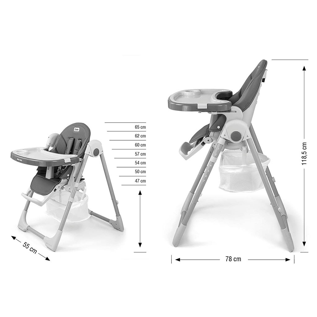 The upholstery of the chair is made of eco-friendly leather and has an extra soft insert for the little ones. For the safety of the child, it is equipped with 5-point adjustable belts and an additional anti-slip barrier. There is a handle on the back of the backrest for hanging the tray. The backrest and footrest can be reclined. The seat can be raised or lowered in 7 degrees and the legs have built-in rubber castors. The whole structure can be folded easily and smoothly.