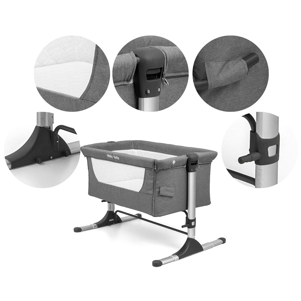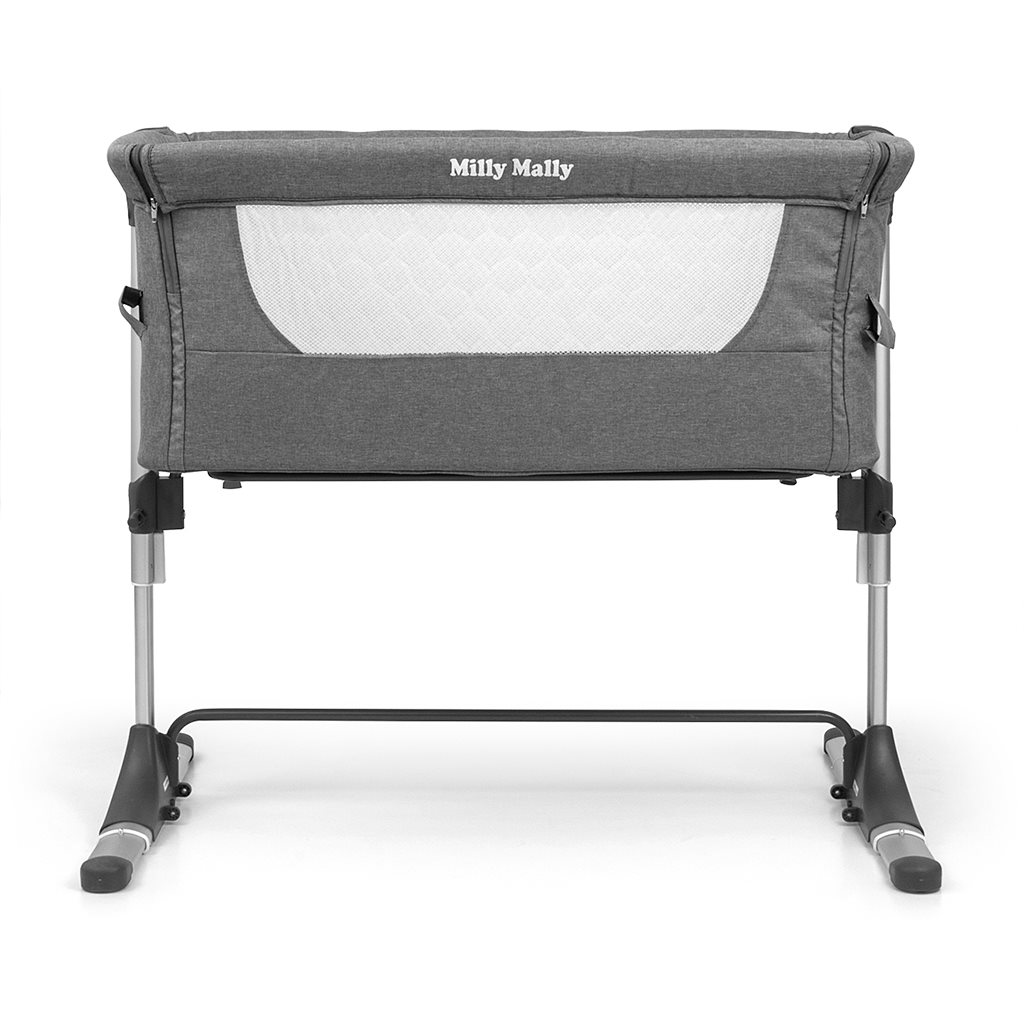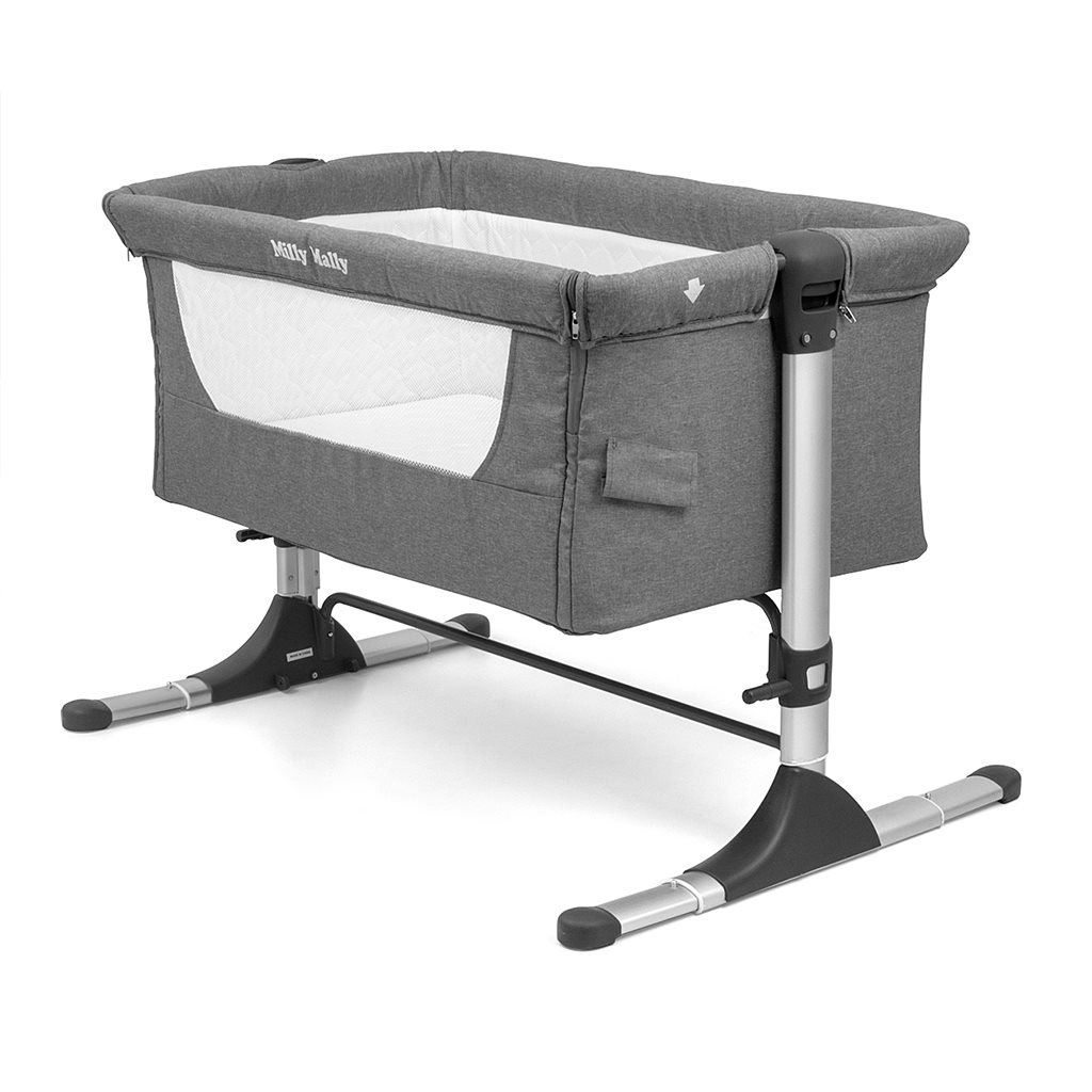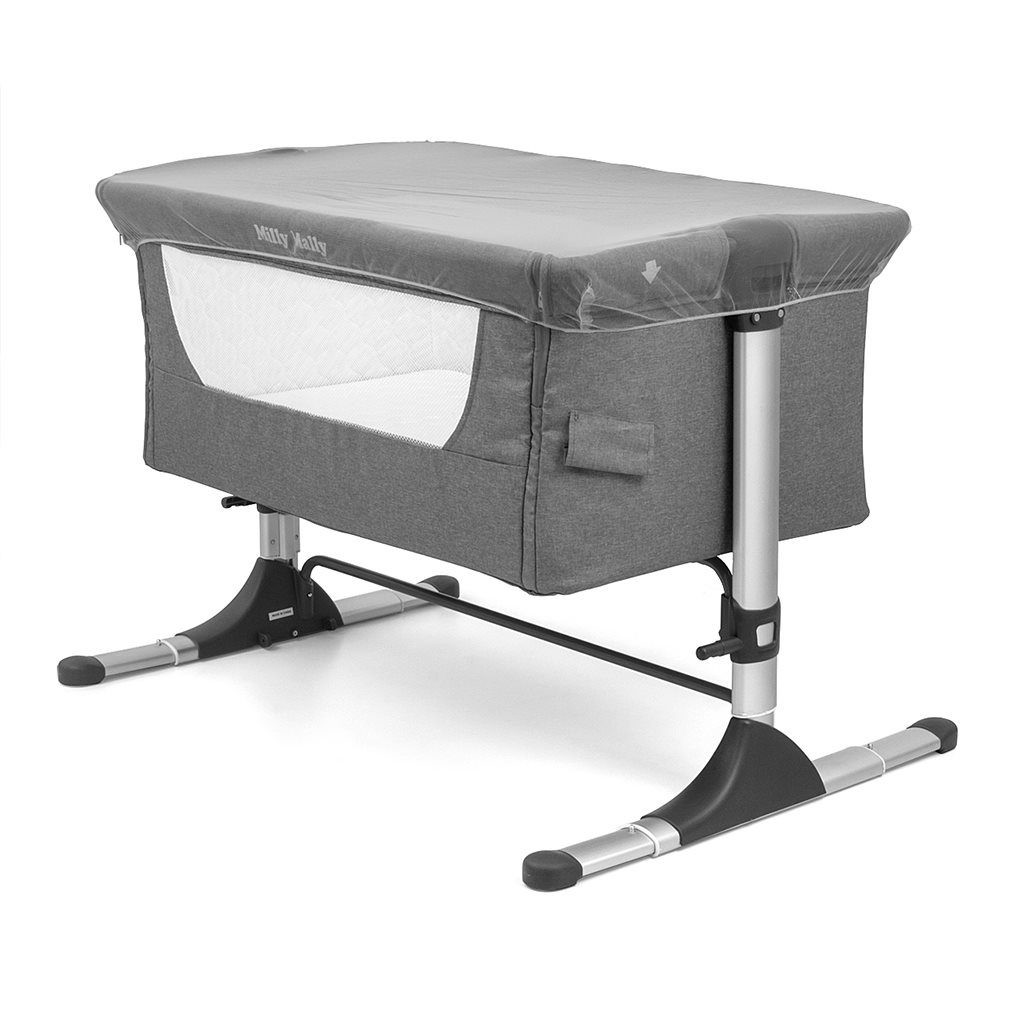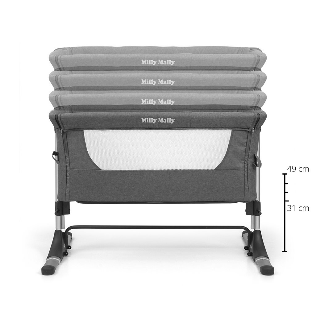 Super crib Milly Mally Side by Side. It helps parents to take care of the baby in the first months of life. It allows mums to feed baby without getting out of bed and creates a close relationship between family members. It serves as a classic crib. Just slide the crib to your bed, adjust the height of the crib legs and open the side of the crib. One side of the crib opens with a zipper. Includes a soft foam mattress that is ideal, for a healthy and comfortable rest. Another part includes special straps that allow you to attach the crib to the parents' bed frame. A unique crib for moms and babies for a feeling of close proximity. Characteristics: