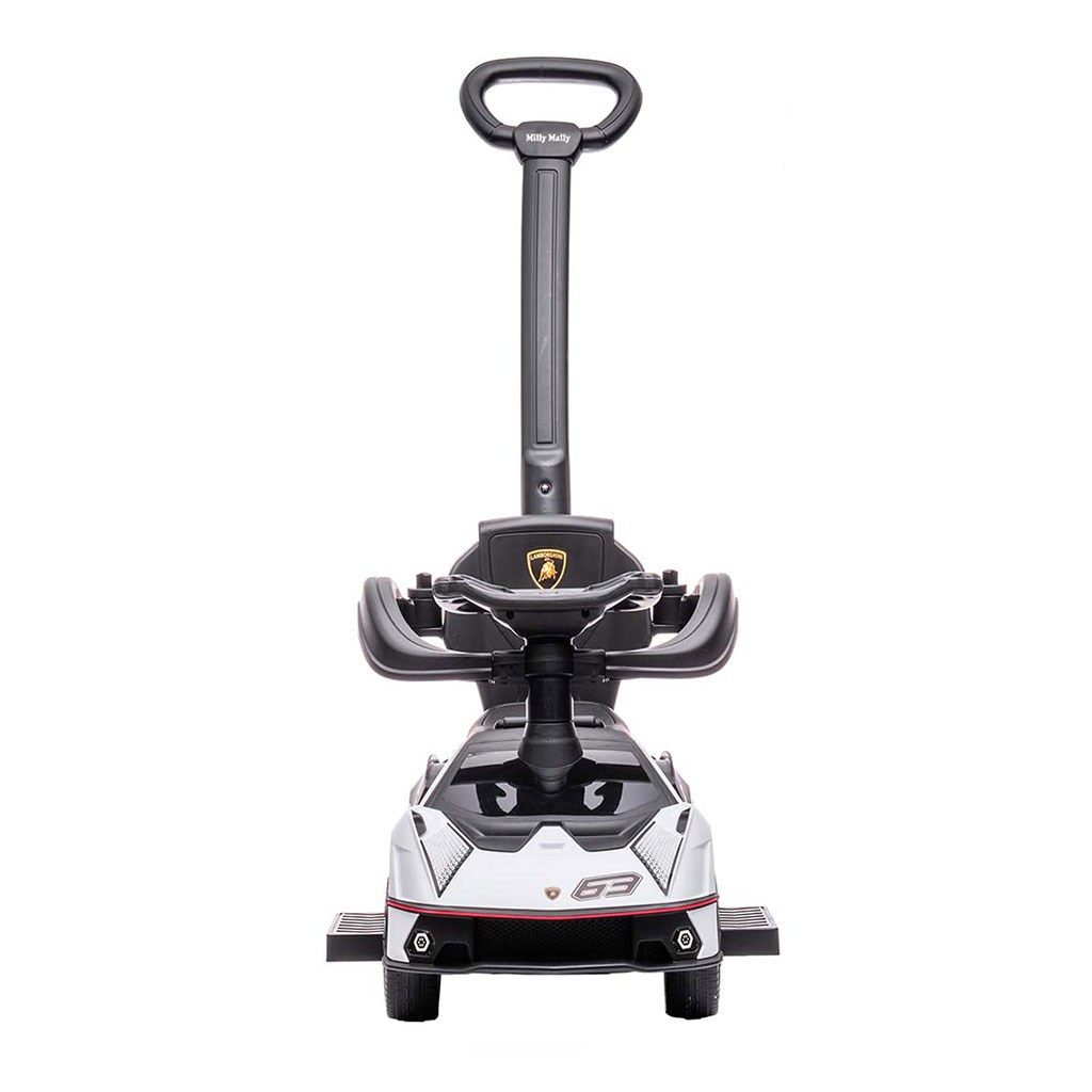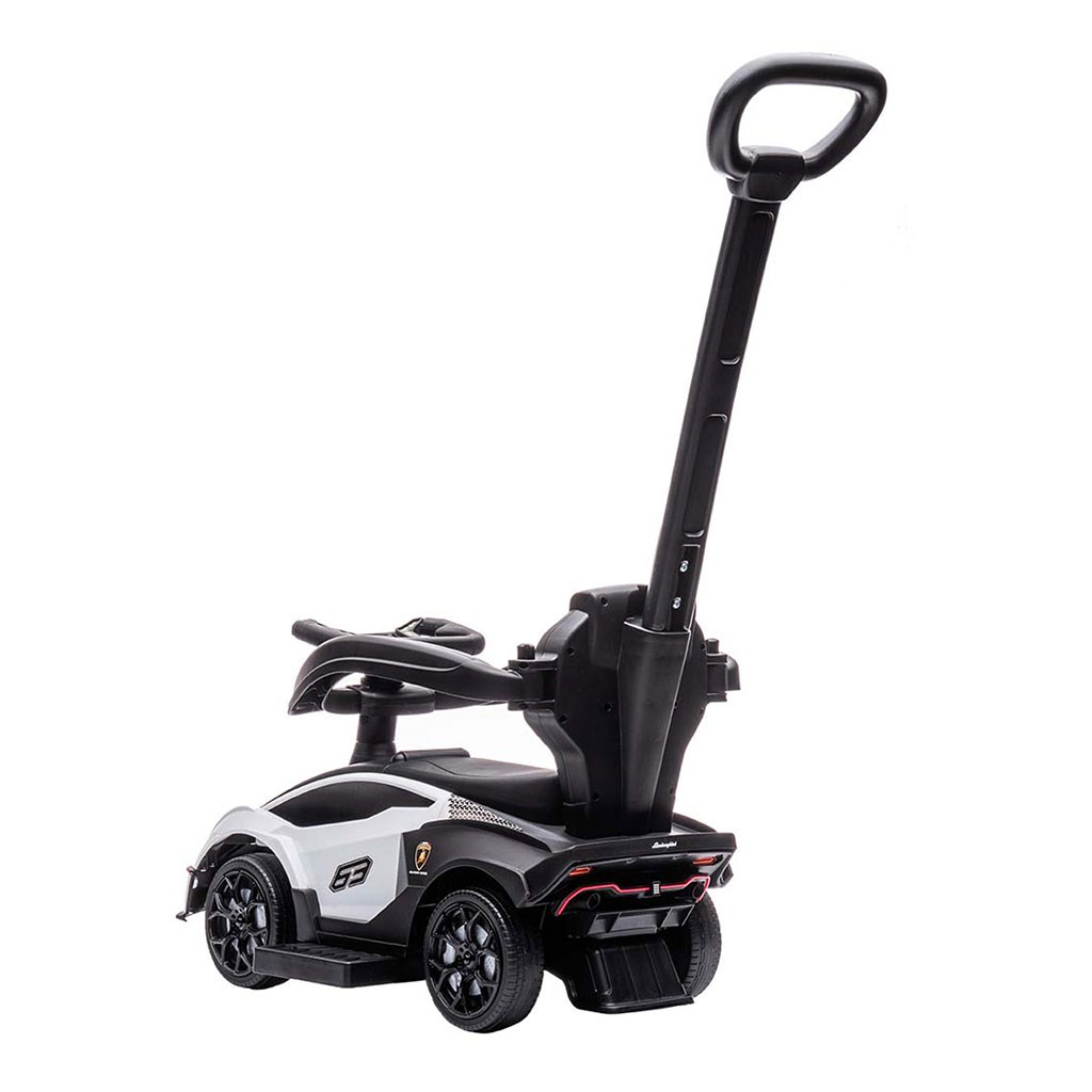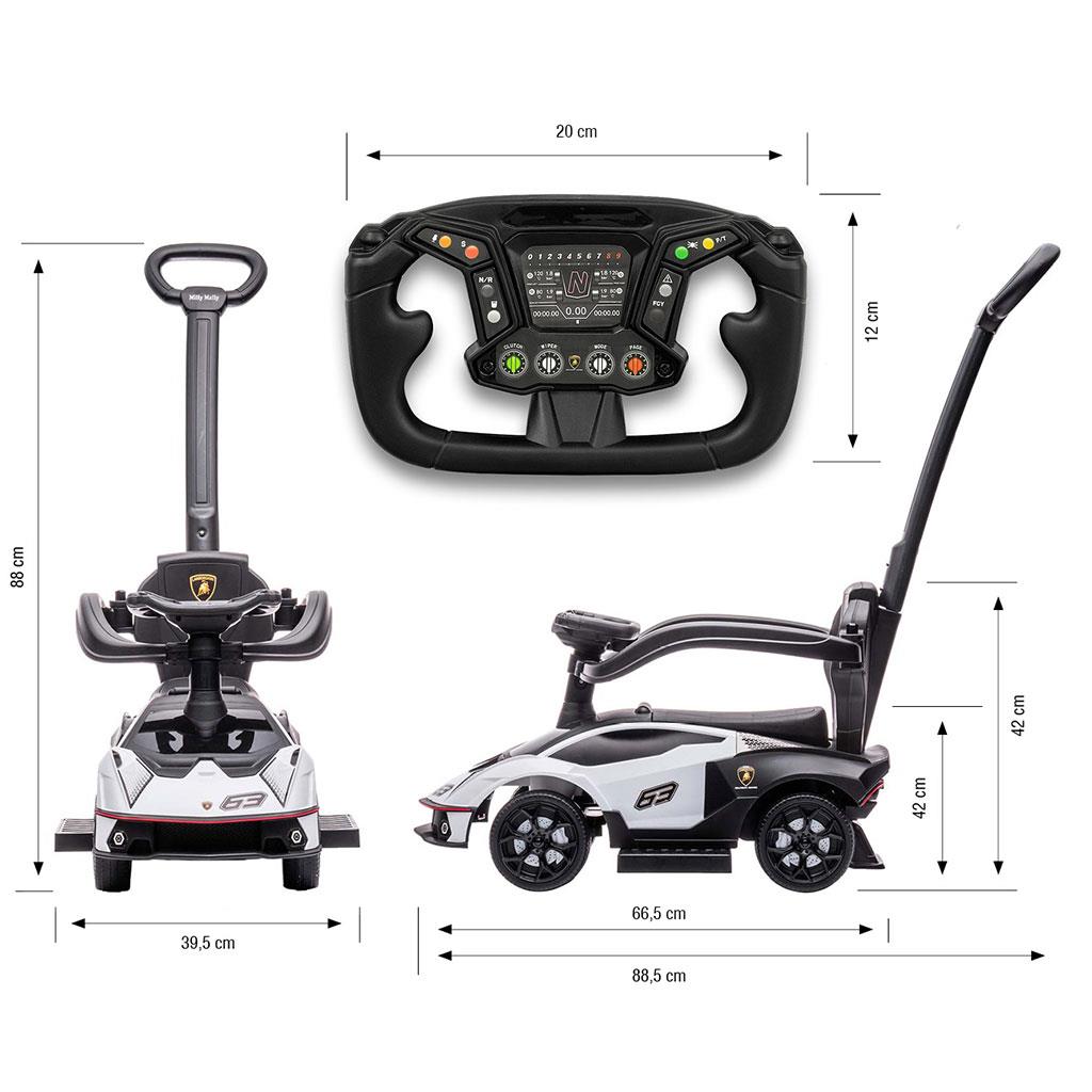 The Lamborghini children's bicycle with guide bar is made under license from Lamborghini and Lamborghini Bull and Shield. Your little racer will feel like he or she is in a real supercar. The car is made with attention to every detail and the quality of the materials used. Its appearance will catch the attention of not only every child, but also parents. The scooter helps to develop the child's motor skills and your little racer or racer will have a lot of fun with it. The car has buttons on the steering wheel that emit various melodies and sounds. The tires are made of PVC -thermoplastic material, which is characterized by great flexibility and durability, so they can be used on all surfaces without damaging or scratching them.